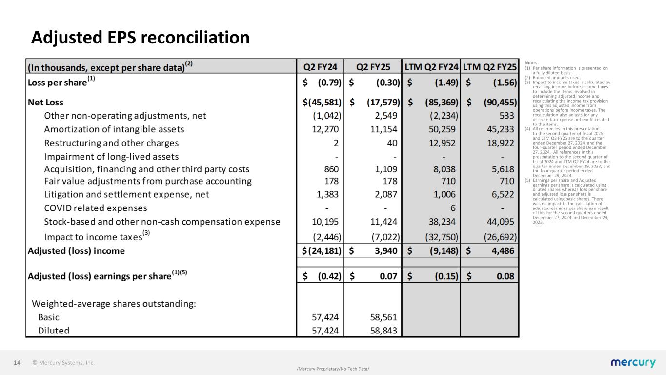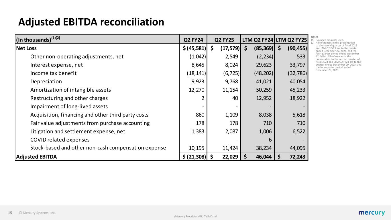 © Mercury Systems, Inc. /Mercury Proprietary/No Tech Data/ Adjusted EPS reconciliation 14 Notes (1) Per share information is presented on a fully diluted basis. (2) Rounded amounts used. (3) Impact to income taxes is calculated by recasting income before income taxes to include the items involved in determining adjusted income and recalculating the income tax provision using this adjusted income from operations before income taxes. The recalculation also adjusts for any discrete tax expense or benefit related to the items. (4) All references in this presentation to the second quarter of fiscal 2025 and LTM Q2 FY25 are to the quarter ended December 27, 2024, and the four-quarter period ended December 27, 2024. All references in this presentation to the second quarter of fiscal 2024 and LTM Q2 FY24 are to the quarter ended December 29, 2023, and the four-quarter period ended December 29, 2023. (5) Earnings per share and Adjusted earnings per share is calculated using diluted shares whereas loss per share and adjusted loss per share is calculated using basic shares. There was no impact to the calculation of adjusted earnings per share as a result of this for the second quarters ended December 27, 2024 and December 29, 2023.