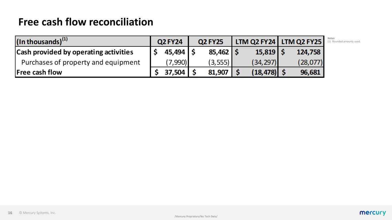 © Mercury Systems, Inc. /Mercury Proprietary/No Tech Data/ Adjusted EBITDA reconciliation 15 Notes (1) Rounded amounts used. (2) All references in this presentation to the second quarter of fiscal 2025 and LTM Q2 FY25 are to the quarter ended December 27, 2024, and the four-quarter period ended December 27, 2024. All references in this presentation to the second quarter of fiscal 2024 and LTM Q2 FY24 are to the quarter ended December 29, 2023, and the four-quarter period ended December 29, 2023. (In thousands)(1)(2) Q2 FY24 Q2 FY25 LTM Q2 FY24 LTM Q2 FY25 Net Loss (45,581)$ (17,579)$ (85,369)$ (90,455)$ Other non-operating adjustments, net (1,042) 2,549 (2,234) 533 Interest expense, net 8,645 8,024 29,623 33,797 Income tax benefit (18,141) (6,725) (48,202) (32,786) Depreciation 9,923 9,768 41,021 40,054 Amortization of intangible assets 12,270 11,154 50,259 45,233 Restructuring and other charges 2 40 12,952 18,922 Impairment of long-lived assets - - - - Acquisition, financing and other third party costs 860 1,109 8,038 5,618 Fair value adjustments from purchase accounting 178 178 710 710 Litigation and settlement expense, net 1,383 2,087 1,006 6,522 COVID related expenses - - 6 - Stock-based and other non-cash compensation expense 10,195 11,424 38,234 44,095 Adjusted EBITDA (21,308)$ 22,029$ 46,044$ 72,243$