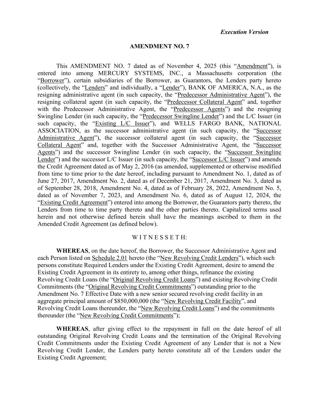 Execution Version AMENDMENT NO. 7 This AMENDMENT NO. 7 dated as of November 4, 2025 (this “Amendment”), is entered into among MERCURY SYSTEMS, INC., a Massachusetts corporation (the “Borrower”), certain subsidiaries of the Borrower, as Guarantors, the Lenders party hereto (collectively, the “Lenders” and individually, a “Lender”), BANK OF AMERICA, N.A., as the resigning administrative agent (in such capacity, the “Predecessor Administrative Agent”), the resigning collateral agent (in such capacity, the “Predecessor Collateral Agent” and, together with the Predecessor Administrative Agent, the “Predecessor Agents”) and the resigning Swingline Lender (in such capacity, the “Predecessor Swingline Lender”) and the L/C Issuer (in such capacity, the “Existing L/C Issuer”), and WELLS FARGO BANK, NATIONAL ASSOCIATION, as the successor administrative agent (in such capacity, the “Successor Administrative Agent”), the successor collateral agent (in such capacity, the “Successor Collateral Agent” and, together with the Successor Administrative Agent, the “Successor Agents”) and the successor Swingline Lender (in such capacity, the “Successor Swingline Lender”) and the successor L/C Issuer (in such capacity, the “Successor L/C Issuer”) and amends the Credit Agreement dated as of May 2, 2016 (as amended, supplemented or otherwise modified from time to time prior to the date hereof, including pursuant to Amendment No. 1, dated as of June 27, 2017, Amendment No. 2, dated as of December 21, 2017, Amendment No. 3, dated as of September 28, 2018, Amendment No. 4, dated as of February 28, 2022, Amendment No. 5, dated as of November 7, 2023, and Amendment No. 6, dated as of August 12, 2024, the “Existing Credit Agreement”) entered into among the Borrower, the Guarantors party thereto, the Lenders from time to time party thereto and the other parties thereto. Capitalized terms used herein and not otherwise defined herein shall have the meanings ascribed to them in the Amended Credit Agreement (as defined below). W I T N E S S E T H: WHEREAS, on the date hereof, the Borrower, the Successor Administrative Agent and each Person listed on Schedule 2.01 hereto (the “New Revolving Credit Lenders”), which such persons constitute Required Lenders under the Existing Credit Agreement, desire to amend the Existing Credit Agreement in its entirety to, among other things, refinance the existing Revolving Credit Loans (the “Original Revolving Credit Loans”) and existing Revolving Credit Commitments (the “Original Revolving Credit Commitments”) outstanding prior to the Amendment No. 7 Effective Date with a new senior secured revolving credit facility in an aggregate principal amount of $850,000,000 (the “New Revolving Credit Facility”, and Revolving Credit Loans thereunder, the “New Revolving Credit Loans”) and the commitments thereunder (the “New Revolving Credit Commitments”); WHEREAS, after giving effect to the repayment in full on the date hereof of all outstanding Original Revolving Credit Loans and the termination of the Original Revolving Credit Commitments under the Existing Credit Agreement of any Lender that is not a New Revolving Credit Lender, the Lenders party hereto constitute all of the Lenders under the Existing Credit Agreement;
