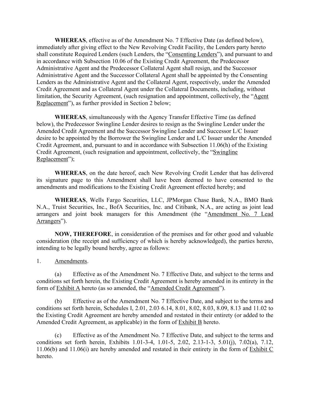 WHEREAS, effective as of the Amendment No. 7 Effective Date (as defined below), immediately after giving effect to the New Revolving Credit Facility, the Lenders party hereto shall constitute Required Lenders (such Lenders, the “Consenting Lenders”), and pursuant to and in accordance with Subsection 10.06 of the Existing Credit Agreement, the Predecessor Administrative Agent and the Predecessor Collateral Agent shall resign, and the Successor Administrative Agent and the Successor Collateral Agent shall be appointed by the Consenting Lenders as the Administrative Agent and the Collateral Agent, respectively, under the Amended Credit Agreement and as Collateral Agent under the Collateral Documents, including, without limitation, the Security Agreement, (such resignation and appointment, collectively, the “Agent Replacement”), as further provided in Section 2 below; WHEREAS, simultaneously with the Agency Transfer Effective Time (as defined below), the Predecessor Swingline Lender desires to resign as the Swingline Lender under the Amended Credit Agreement and the Successor Swingline Lender and Successor L/C Issuer desire to be appointed by the Borrower the Swingline Lender and L/C Issuer under the Amended Credit Agreement, and, pursuant to and in accordance with Subsection 11.06(h) of the Existing Credit Agreement, (such resignation and appointment, collectively, the “Swingline Replacement”); WHEREAS, on the date hereof, each New Revolving Credit Lender that has delivered its signature page to this Amendment shall have been deemed to have consented to the amendments and modifications to the Existing Credit Agreement effected hereby; and WHEREAS, Wells Fargo Securities, LLC, JPMorgan Chase Bank, N.A., BMO Bank N.A., Truist Securities, Inc., BofA Securities, Inc. and Citibank, N.A., are acting as joint lead arrangers and joint book managers for this Amendment (the “Amendment No. 7 Lead Arrangers”). NOW, THEREFORE, in consideration of the premises and for other good and valuable consideration (the receipt and sufficiency of which is hereby acknowledged), the parties hereto, intending to be legally bound hereby, agree as follows: 1. Amendments. (a) Effective as of the Amendment No. 7 Effective Date, and subject to the terms and conditions set forth herein, the Existing Credit Agreement is hereby amended in its entirety in the form of Exhibit A hereto (as so amended, the “Amended Credit Agreement”). (b) Effective as of the Amendment No. 7 Effective Date, and subject to the terms and conditions set forth herein, Schedules I, 2.01, 2.03 6.14, 8.01, 8.02, 8.03, 8.09, 8.13 and 11.02 to the Existing Credit Agreement are hereby amended and restated in their entirety (or added to the Amended Credit Agreement, as applicable) in the form of Exhibit B hereto. (c) Effective as of the Amendment No. 7 Effective Date, and subject to the terms and conditions set forth herein, Exhibits 1.01-3-4, 1.01-5, 2.02, 2.13-1-3, 5.01(j), 7.02(a), 7.12, 11.06(b) and 11.06(i) are hereby amended and restated in their entirety in the form of Exhibit C hereto.
