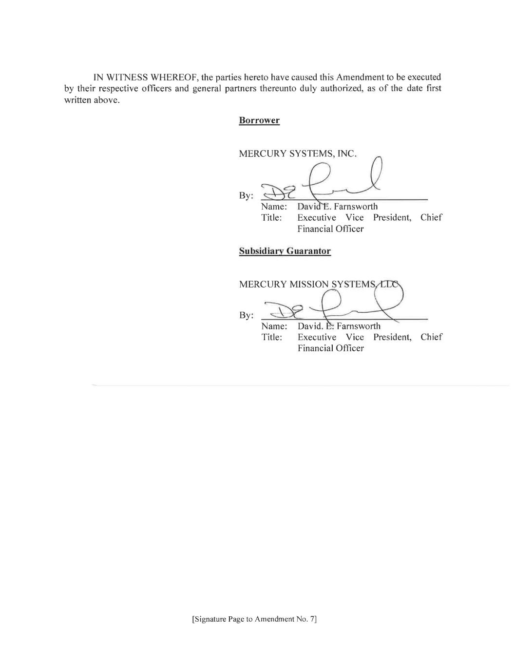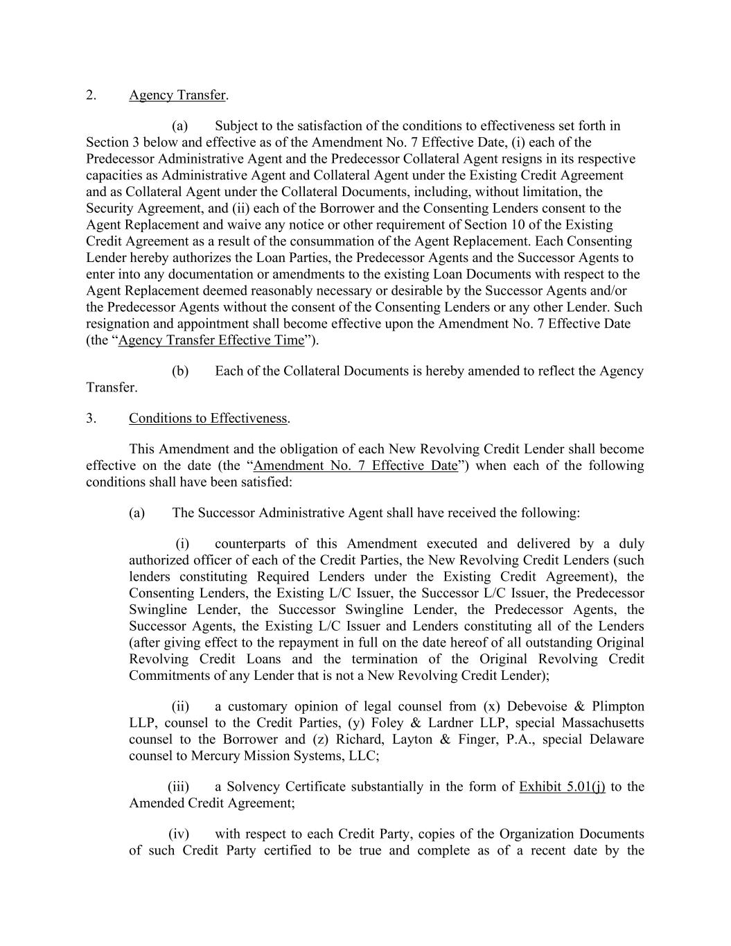 2. Agency Transfer. (a) Subject to the satisfaction of the conditions to effectiveness set forth in Section 3 below and effective as of the Amendment No. 7 Effective Date, (i) each of the Predecessor Administrative Agent and the Predecessor Collateral Agent resigns in its respective capacities as Administrative Agent and Collateral Agent under the Existing Credit Agreement and as Collateral Agent under the Collateral Documents, including, without limitation, the Security Agreement, and (ii) each of the Borrower and the Consenting Lenders consent to the Agent Replacement and waive any notice or other requirement of Section 10 of the Existing Credit Agreement as a result of the consummation of the Agent Replacement. Each Consenting Lender hereby authorizes the Loan Parties, the Predecessor Agents and the Successor Agents to enter into any documentation or amendments to the existing Loan Documents with respect to the Agent Replacement deemed reasonably necessary or desirable by the Successor Agents and/or the Predecessor Agents without the consent of the Consenting Lenders or any other Lender. Such resignation and appointment shall become effective upon the Amendment No. 7 Effective Date (the “Agency Transfer Effective Time”). (b) Each of the Collateral Documents is hereby amended to reflect the Agency Transfer. 3. Conditions to Effectiveness. This Amendment and the obligation of each New Revolving Credit Lender shall become effective on the date (the “Amendment No. 7 Effective Date”) when each of the following conditions shall have been satisfied: (a) The Successor Administrative Agent shall have received the following: (i) counterparts of this Amendment executed and delivered by a duly authorized officer of each of the Credit Parties, the New Revolving Credit Lenders (such lenders constituting Required Lenders under the Existing Credit Agreement), the Consenting Lenders, the Existing L/C Issuer, the Successor L/C Issuer, the Predecessor Swingline Lender, the Successor Swingline Lender, the Predecessor Agents, the Successor Agents, the Existing L/C Issuer and Lenders constituting all of the Lenders (after giving effect to the repayment in full on the date hereof of all outstanding Original Revolving Credit Loans and the termination of the Original Revolving Credit Commitments of any Lender that is not a New Revolving Credit Lender); (ii) a customary opinion of legal counsel from (x) Debevoise & Plimpton LLP, counsel to the Credit Parties, (y) Foley & Lardner LLP, special Massachusetts counsel to the Borrower and (z) Richard, Layton & Finger, P.A., special Delaware counsel to Mercury Mission Systems, LLC; (iii) a Solvency Certificate substantially in the form of Exhibit 5.01(j) to the Amended Credit Agreement; (iv) with respect to each Credit Party, copies of the Organization Documents of such Credit Party certified to be true and complete as of a recent date by the