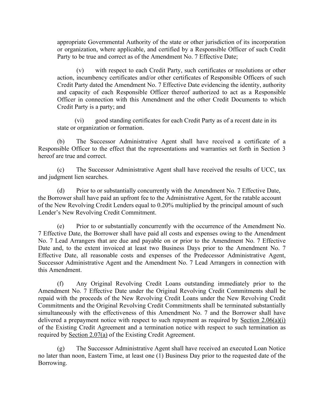 appropriate Governmental Authority of the state or other jurisdiction of its incorporation or organization, where applicable, and certified by a Responsible Officer of such Credit Party to be true and correct as of the Amendment No. 7 Effective Date; (v) with respect to each Credit Party, such certificates or resolutions or other action, incumbency certificates and/or other certificates of Responsible Officers of such Credit Party dated the Amendment No. 7 Effective Date evidencing the identity, authority and capacity of each Responsible Officer thereof authorized to act as a Responsible Officer in connection with this Amendment and the other Credit Documents to which Credit Party is a party; and (vi) good standing certificates for each Credit Party as of a recent date in its state or organization or formation. (b) The Successor Administrative Agent shall have received a certificate of a Responsible Officer to the effect that the representations and warranties set forth in Section 3 hereof are true and correct. (c) The Successor Administrative Agent shall have received the results of UCC, tax and judgment lien searches. (d) Prior to or substantially concurrently with the Amendment No. 7 Effective Date, the Borrower shall have paid an upfront fee to the Administrative Agent, for the ratable account of the New Revolving Credit Lenders equal to 0.20% multiplied by the principal amount of such Lender’s New Revolving Credit Commitment. (e) Prior to or substantially concurrently with the occurrence of the Amendment No. 7 Effective Date, the Borrower shall have paid all costs and expenses owing to the Amendment No. 7 Lead Arrangers that are due and payable on or prior to the Amendment No. 7 Effective Date and, to the extent invoiced at least two Business Days prior to the Amendment No. 7 Effective Date, all reasonable costs and expenses of the Predecessor Administrative Agent, Successor Administrative Agent and the Amendment No. 7 Lead Arrangers in connection with this Amendment. (f) Any Original Revolving Credit Loans outstanding immediately prior to the Amendment No. 7 Effective Date under the Original Revolving Credit Commitments shall be repaid with the proceeds of the New Revolving Credit Loans under the New Revolving Credit Commitments and the Original Revolving Credit Commitments shall be terminated substantially simultaneously with the effectiveness of this Amendment No. 7 and the Borrower shall have delivered a prepayment notice with respect to such repayment as required by Section 2.06(a)(i) of the Existing Credit Agreement and a termination notice with respect to such termination as required by Section 2.07(a) of the Existing Credit Agreement. (g) The Successor Administrative Agent shall have received an executed Loan Notice no later than noon, Eastern Time, at least one (1) Business Day prior to the requested date of the Borrowing.