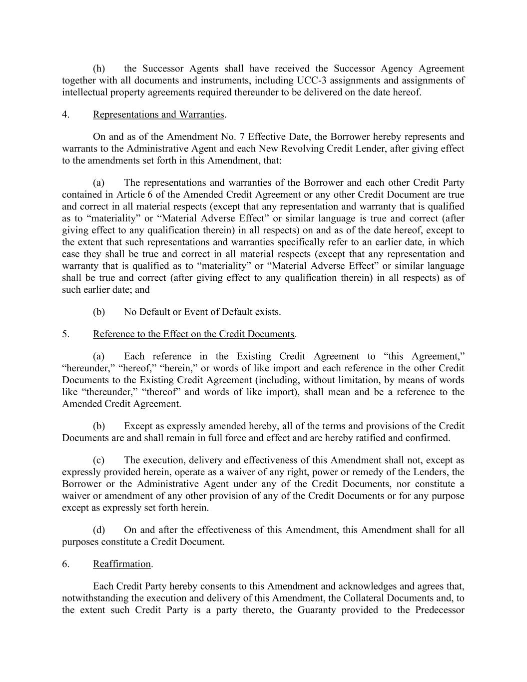 (h) the Successor Agents shall have received the Successor Agency Agreement together with all documents and instruments, including UCC-3 assignments and assignments of intellectual property agreements required thereunder to be delivered on the date hereof. 4. Representations and Warranties. On and as of the Amendment No. 7 Effective Date, the Borrower hereby represents and warrants to the Administrative Agent and each New Revolving Credit Lender, after giving effect to the amendments set forth in this Amendment, that: (a) The representations and warranties of the Borrower and each other Credit Party contained in Article 6 of the Amended Credit Agreement or any other Credit Document are true and correct in all material respects (except that any representation and warranty that is qualified as to “materiality” or “Material Adverse Effect” or similar language is true and correct (after giving effect to any qualification therein) in all respects) on and as of the date hereof, except to the extent that such representations and warranties specifically refer to an earlier date, in which case they shall be true and correct in all material respects (except that any representation and warranty that is qualified as to “materiality” or “Material Adverse Effect” or similar language shall be true and correct (after giving effect to any qualification therein) in all respects) as of such earlier date; and (b) No Default or Event of Default exists. 5. Reference to the Effect on the Credit Documents. (a) Each reference in the Existing Credit Agreement to “this Agreement,” “hereunder,” “hereof,” “herein,” or words of like import and each reference in the other Credit Documents to the Existing Credit Agreement (including, without limitation, by means of words like “thereunder,” “thereof” and words of like import), shall mean and be a reference to the Amended Credit Agreement. (b) Except as expressly amended hereby, all of the terms and provisions of the Credit Documents are and shall remain in full force and effect and are hereby ratified and confirmed. (c) The execution, delivery and effectiveness of this Amendment shall not, except as expressly provided herein, operate as a waiver of any right, power or remedy of the Lenders, the Borrower or the Administrative Agent under any of the Credit Documents, nor constitute a waiver or amendment of any other provision of any of the Credit Documents or for any purpose except as expressly set forth herein. (d) On and after the effectiveness of this Amendment, this Amendment shall for all purposes constitute a Credit Document. 6. Reaffirmation. Each Credit Party hereby consents to this Amendment and acknowledges and agrees that, notwithstanding the execution and delivery of this Amendment, the Collateral Documents and, to the extent such Credit Party is a party thereto, the Guaranty provided to the Predecessor