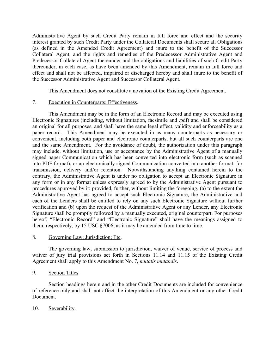 Administrative Agent by such Credit Party remain in full force and effect and the security interest granted by such Credit Party under the Collateral Documents shall secure all Obligations (as defined in the Amended Credit Agreement) and inure to the benefit of the Successor Collateral Agent, and the rights and remedies of the Predecessor Administrative Agent and Predecessor Collateral Agent thereunder and the obligations and liabilities of such Credit Party thereunder, in each case, as have been amended by this Amendment, remain in full force and effect and shall not be affected, impaired or discharged hereby and shall inure to the benefit of the Successor Administrative Agent and Successor Collateral Agent. This Amendment does not constitute a novation of the Existing Credit Agreement. 7. Execution in Counterparts; Effectiveness. This Amendment may be in the form of an Electronic Record and may be executed using Electronic Signatures (including, without limitation, facsimile and .pdf) and shall be considered an original for all purposes, and shall have the same legal effect, validity and enforceability as a paper record. This Amendment may be executed in as many counterparts as necessary or convenient, including both paper and electronic counterparts, but all such counterparts are one and the same Amendment. For the avoidance of doubt, the authorization under this paragraph may include, without limitation, use or acceptance by the Administrative Agent of a manually signed paper Communication which has been converted into electronic form (such as scanned into PDF format), or an electronically signed Communication converted into another format, for transmission, delivery and/or retention. Notwithstanding anything contained herein to the contrary, the Administrative Agent is under no obligation to accept an Electronic Signature in any form or in any format unless expressly agreed to by the Administrative Agent pursuant to procedures approved by it; provided, further, without limiting the foregoing, (a) to the extent the Administrative Agent has agreed to accept such Electronic Signature, the Administrative and each of the Lenders shall be entitled to rely on any such Electronic Signature without further verification and (b) upon the request of the Administrative Agent or any Lender, any Electronic Signature shall be promptly followed by a manually executed, original counterpart. For purposes hereof, “Electronic Record” and “Electronic Signature” shall have the meanings assigned to them, respectively, by 15 USC §7006, as it may be amended from time to time. 8. Governing Law; Jurisdiction; Etc. The governing law, submission to jurisdiction, waiver of venue, service of process and waiver of jury trial provisions set forth in Sections 11.14 and 11.15 of the Existing Credit Agreement shall apply to this Amendment No. 7, mutatis mutandis. 9. Section Titles. Section headings herein and in the other Credit Documents are included for convenience of reference only and shall not affect the interpretation of this Amendment or any other Credit Document. 10. Severability.