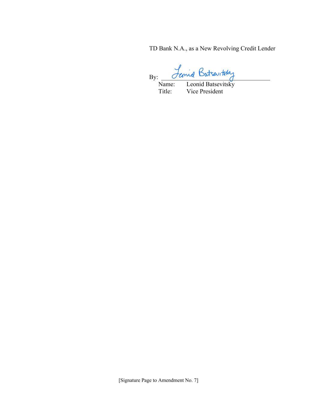 [Signature Page to Amendment No. 7] TD Bank N.A., as a New Revolving Credit Lender By: ___________________________________ Name: Leonid Batsevitsky Title: Vice President