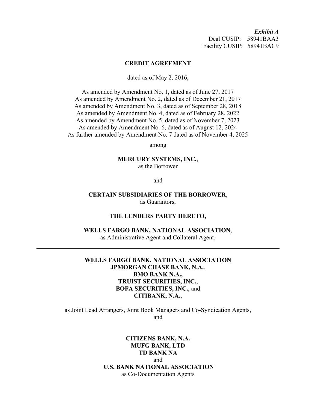 Exhibit A Deal CUSIP: 58941BAA3 Facility CUSIP: 58941BAC9 CREDIT AGREEMENT dated as of May 2, 2016, As amended by Amendment No. 1, dated as of June 27, 2017 As amended by Amendment No. 2, dated as of December 21, 2017 As amended by Amendment No. 3, dated as of September 28, 2018 As amended by Amendment No. 4, dated as of February 28, 2022 As amended by Amendment No. 5, dated as of November 7, 2023 As amended by Amendment No. 6, dated as of August 12, 2024 As further amended by Amendment No. 7 dated as of November 4, 2025 among MERCURY SYSTEMS, INC., as the Borrower and CERTAIN SUBSIDIARIES OF THE BORROWER, as Guarantors, THE LENDERS PARTY HERETO, WELLS FARGO BANK, NATIONAL ASSOCIATION, as Administrative Agent and Collateral Agent, WELLS FARGO BANK, NATIONAL ASSOCIATION JPMORGAN CHASE BANK, N.A., BMO BANK N.A., TRUIST SECURITIES, INC., BOFA SECURITIES, INC., and CITIBANK, N.A., as Joint Lead Arrangers, Joint Book Managers and Co-Syndication Agents, and CITIZENS BANK, N.A. MUFG BANK, LTD TD BANK NA and U.S. BANK NATIONAL ASSOCIATION as Co-Documentation Agents