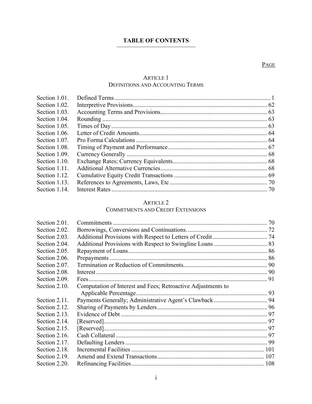i TABLE OF CONTENTS PAGE ARTICLE 1 DEFINITIONS AND ACCOUNTING TERMS Section 1.01. Defined Terms ...................................................................................................... 1 Section 1.02. Interpretive Provisions ........................................................................................ 62 Section 1.03. Accounting Terms and Provisions ...................................................................... 63 Section 1.04. Rounding ............................................................................................................ 63 Section 1.05. Times of Day ...................................................................................................... 63 Section 1.06. Letter of Credit Amounts .................................................................................... 64 Section 1.07. Pro Forma Calculations ...................................................................................... 64 Section 1.08. Timing of Payment and Performance ................................................................. 67 Section 1.09. Currency Generally ............................................................................................ 68 Section 1.10. Exchange Rates; Currency Equivalents .............................................................. 68 Section 1.11. Additional Alternative Currencies ...................................................................... 68 Section 1.12. Cumulative Equity Credit Transactions ............................................................. 69 Section 1.13. References to Agreements, Laws, Etc ................................................................ 70 Section 1.14. Interest Rates ...................................................................................................... 70 ARTICLE 2 COMMITMENTS AND CREDIT EXTENSIONS Section 2.01. Commitments ..................................................................................................... 70 Section 2.02. Borrowings, Conversions and Continuations. .................................................... 72 Section 2.03. Additional Provisions with Respect to Letters of Credit .................................... 74 Section 2.04. Additional Provisions with Respect to Swingline Loans ................................... 83 Section 2.05. Repayment of Loans ........................................................................................... 86 Section 2.06. Prepayments ....................................................................................................... 86 Section 2.07. Termination or Reduction of Commitments ....................................................... 90 Section 2.08. Interest ................................................................................................................ 90 Section 2.09. Fees ..................................................................................................................... 91 Section 2.10. Computation of Interest and Fees; Retroactive Adjustments to Applicable Percentage ...................................................................................... 93 Section 2.11. Payments Generally; Administrative Agent’s Clawback ................................... 94 Section 2.12. Sharing of Payments by Lenders ........................................................................ 96 Section 2.13. Evidence of Debt ................................................................................................ 97 Section 2.14. [Reserved] ........................................................................................................... 97 Section 2.15. [Reserved] ........................................................................................................... 97 Section 2.16. Cash Collateral ................................................................................................... 97 Section 2.17. Defaulting Lenders ............................................................................................. 99 Section 2.18. Incremental Facilities ....................................................................................... 101 Section 2.19. Amend and Extend Transactions ...................................................................... 107 Section 2.20. Refinancing Facilities ....................................................................................... 108