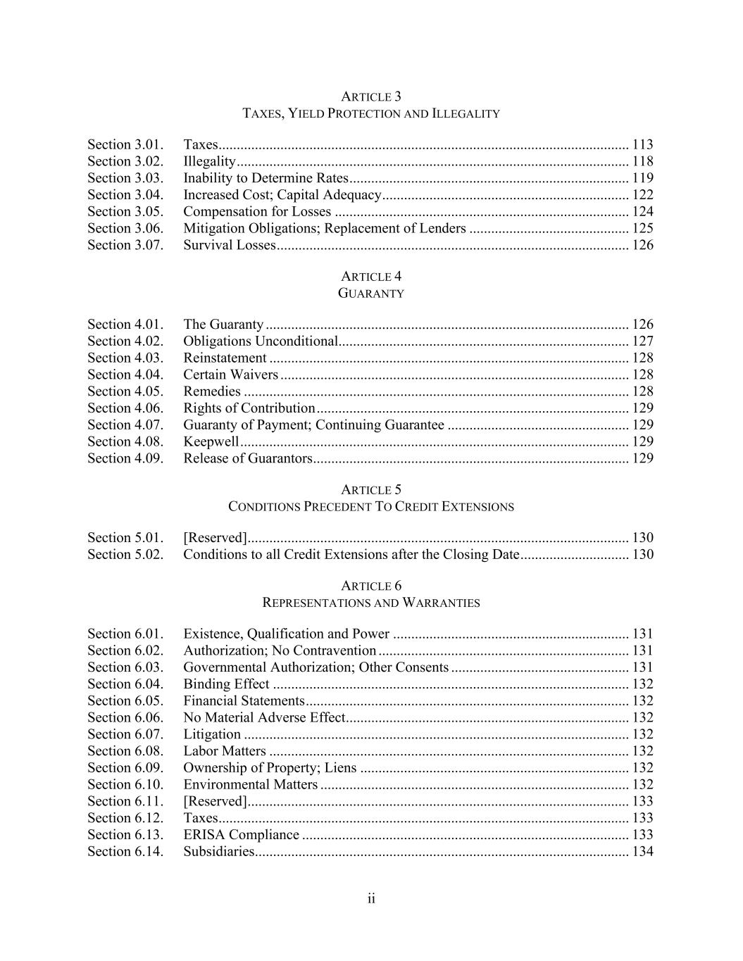 ii ARTICLE 3 TAXES, YIELD PROTECTION AND ILLEGALITY Section 3.01. Taxes ................................................................................................................. 113 Section 3.02. Illegality ............................................................................................................ 118 Section 3.03. Inability to Determine Rates ............................................................................. 119 Section 3.04. Increased Cost; Capital Adequacy .................................................................... 122 Section 3.05. Compensation for Losses ................................................................................. 124 Section 3.06. Mitigation Obligations; Replacement of Lenders ............................................ 125 Section 3.07. Survival Losses ................................................................................................. 126 ARTICLE 4 GUARANTY Section 4.01. The Guaranty .................................................................................................... 126 Section 4.02. Obligations Unconditional ................................................................................ 127 Section 4.03. Reinstatement ................................................................................................... 128 Section 4.04. Certain Waivers ................................................................................................ 128 Section 4.05. Remedies .......................................................................................................... 128 Section 4.06. Rights of Contribution ...................................................................................... 129 Section 4.07. Guaranty of Payment; Continuing Guarantee .................................................. 129 Section 4.08. Keepwell ........................................................................................................... 129 Section 4.09. Release of Guarantors ....................................................................................... 129 ARTICLE 5 CONDITIONS PRECEDENT TO CREDIT EXTENSIONS Section 5.01. [Reserved] ......................................................................................................... 130 Section 5.02. Conditions to all Credit Extensions after the Closing Date .............................. 130 ARTICLE 6 REPRESENTATIONS AND WARRANTIES Section 6.01. Existence, Qualification and Power ................................................................. 131 Section 6.02. Authorization; No Contravention ..................................................................... 131 Section 6.03. Governmental Authorization; Other Consents ................................................. 131 Section 6.04. Binding Effect .................................................................................................. 132 Section 6.05. Financial Statements ......................................................................................... 132 Section 6.06. No Material Adverse Effect .............................................................................. 132 Section 6.07. Litigation .......................................................................................................... 132 Section 6.08. Labor Matters ................................................................................................... 132 Section 6.09. Ownership of Property; Liens .......................................................................... 132 Section 6.10. Environmental Matters ..................................................................................... 132 Section 6.11. [Reserved] ......................................................................................................... 133 Section 6.12. Taxes ................................................................................................................. 133 Section 6.13. ERISA Compliance .......................................................................................... 133 Section 6.14. Subsidiaries ....................................................................................................... 134