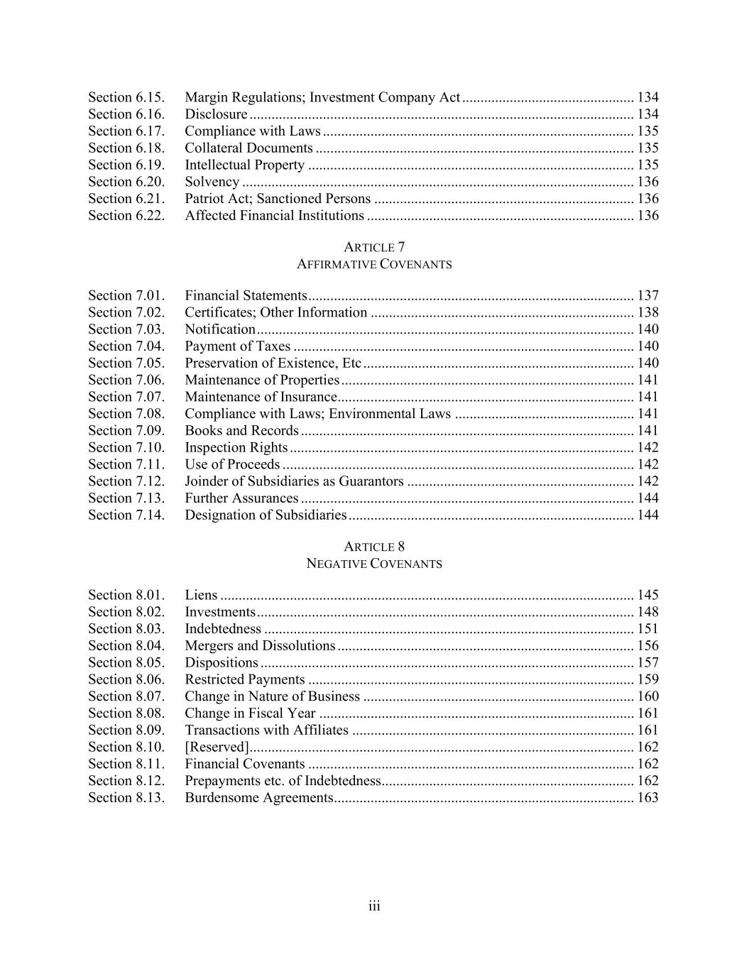 iii Section 6.15. Margin Regulations; Investment Company Act ............................................... 134 Section 6.16. Disclosure ......................................................................................................... 134 Section 6.17. Compliance with Laws ..................................................................................... 135 Section 6.18. Collateral Documents ....................................................................................... 135 Section 6.19. Intellectual Property ......................................................................................... 135 Section 6.20. Solvency ........................................................................................................... 136 Section 6.21. Patriot Act; Sanctioned Persons ....................................................................... 136 Section 6.22. Affected Financial Institutions ......................................................................... 136 ARTICLE 7 AFFIRMATIVE COVENANTS Section 7.01. Financial Statements ......................................................................................... 137 Section 7.02. Certificates; Other Information ........................................................................ 138 Section 7.03. Notification ....................................................................................................... 140 Section 7.04. Payment of Taxes ............................................................................................. 140 Section 7.05. Preservation of Existence, Etc .......................................................................... 140 Section 7.06. Maintenance of Properties ................................................................................ 141 Section 7.07. Maintenance of Insurance ................................................................................. 141 Section 7.08. Compliance with Laws; Environmental Laws ................................................. 141 Section 7.09. Books and Records ........................................................................................... 141 Section 7.10. Inspection Rights .............................................................................................. 142 Section 7.11. Use of Proceeds ................................................................................................ 142 Section 7.12. Joinder of Subsidiaries as Guarantors .............................................................. 142 Section 7.13. Further Assurances ........................................................................................... 144 Section 7.14. Designation of Subsidiaries .............................................................................. 144 ARTICLE 8 NEGATIVE COVENANTS Section 8.01. Liens ................................................................................................................. 145 Section 8.02. Investments ....................................................................................................... 148 Section 8.03. Indebtedness ..................................................................................................... 151 Section 8.04. Mergers and Dissolutions ................................................................................. 156 Section 8.05. Dispositions ...................................................................................................... 157 Section 8.06. Restricted Payments ......................................................................................... 159 Section 8.07. Change in Nature of Business .......................................................................... 160 Section 8.08. Change in Fiscal Year ...................................................................................... 161 Section 8.09. Transactions with Affiliates ............................................................................. 161 Section 8.10. [Reserved] ......................................................................................................... 162 Section 8.11. Financial Covenants ......................................................................................... 162 Section 8.12. Prepayments etc. of Indebtedness ..................................................................... 162 Section 8.13. Burdensome Agreements .................................................................................. 163