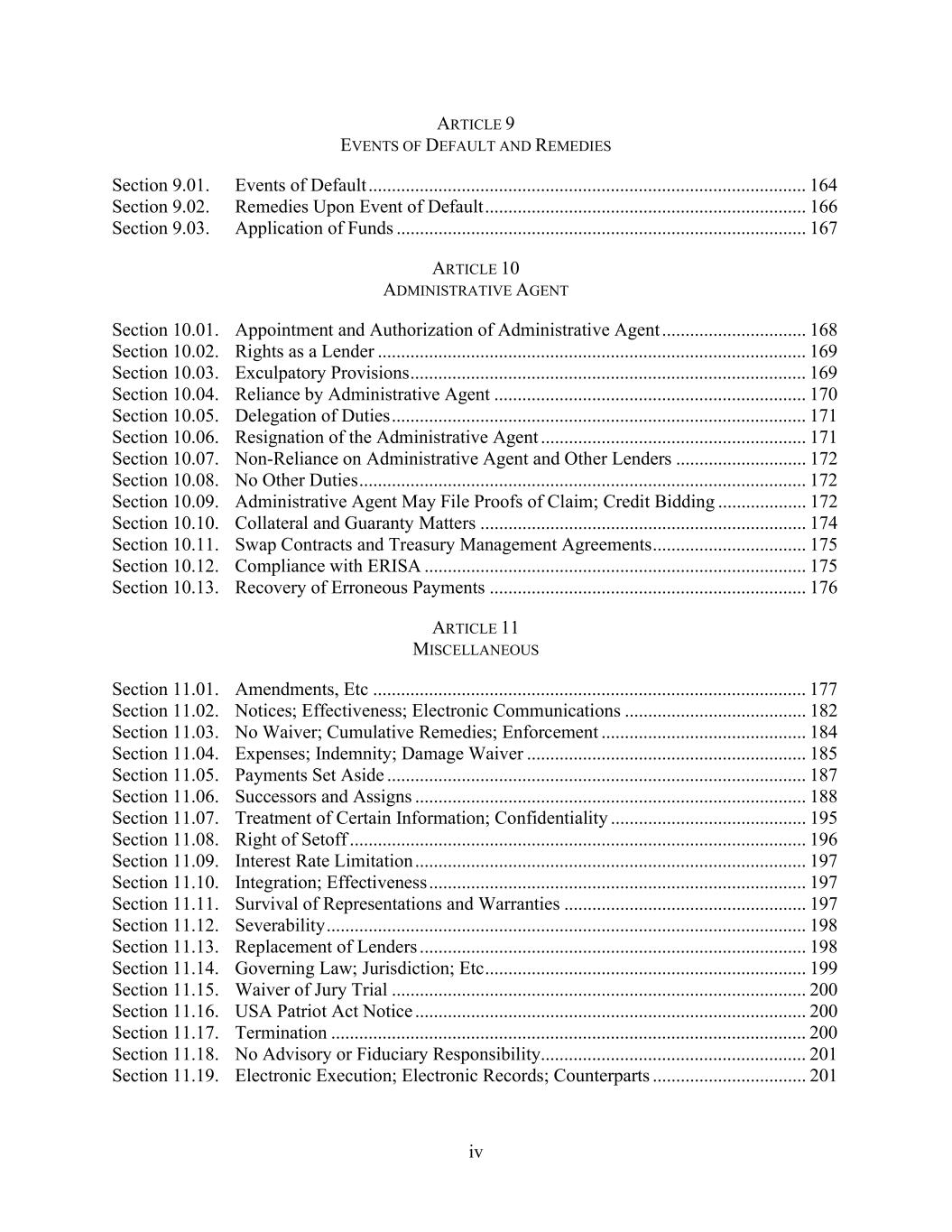 iv ARTICLE 9 EVENTS OF DEFAULT AND REMEDIES Section 9.01. Events of Default .............................................................................................. 164 Section 9.02. Remedies Upon Event of Default ..................................................................... 166 Section 9.03. Application of Funds ........................................................................................ 167 ARTICLE 10 ADMINISTRATIVE AGENT Section 10.01. Appointment and Authorization of Administrative Agent ............................... 168 Section 10.02. Rights as a Lender ............................................................................................ 169 Section 10.03. Exculpatory Provisions ..................................................................................... 169 Section 10.04. Reliance by Administrative Agent ................................................................... 170 Section 10.05. Delegation of Duties ......................................................................................... 171 Section 10.06. Resignation of the Administrative Agent ......................................................... 171 Section 10.07. Non-Reliance on Administrative Agent and Other Lenders ............................ 172 Section 10.08. No Other Duties ................................................................................................ 172 Section 10.09. Administrative Agent May File Proofs of Claim; Credit Bidding ................... 172 Section 10.10. Collateral and Guaranty Matters ...................................................................... 174 Section 10.11. Swap Contracts and Treasury Management Agreements ................................. 175 Section 10.12. Compliance with ERISA .................................................................................. 175 Section 10.13. Recovery of Erroneous Payments .................................................................... 176 ARTICLE 11 MISCELLANEOUS Section 11.01. Amendments, Etc ............................................................................................. 177 Section 11.02. Notices; Effectiveness; Electronic Communications ....................................... 182 Section 11.03. No Waiver; Cumulative Remedies; Enforcement ............................................ 184 Section 11.04. Expenses; Indemnity; Damage Waiver ............................................................ 185 Section 11.05. Payments Set Aside .......................................................................................... 187 Section 11.06. Successors and Assigns .................................................................................... 188 Section 11.07. Treatment of Certain Information; Confidentiality .......................................... 195 Section 11.08. Right of Setoff .................................................................................................. 196 Section 11.09. Interest Rate Limitation .................................................................................... 197 Section 11.10. Integration; Effectiveness ................................................................................. 197 Section 11.11. Survival of Representations and Warranties .................................................... 197 Section 11.12. Severability ....................................................................................................... 198 Section 11.13. Replacement of Lenders ................................................................................... 198 Section 11.14. Governing Law; Jurisdiction; Etc ..................................................................... 199 Section 11.15. Waiver of Jury Trial ......................................................................................... 200 Section 11.16. USA Patriot Act Notice .................................................................................... 200 Section 11.17. Termination ...................................................................................................... 200 Section 11.18. No Advisory or Fiduciary Responsibility ......................................................... 201 Section 11.19. Electronic Execution; Electronic Records; Counterparts ................................. 201