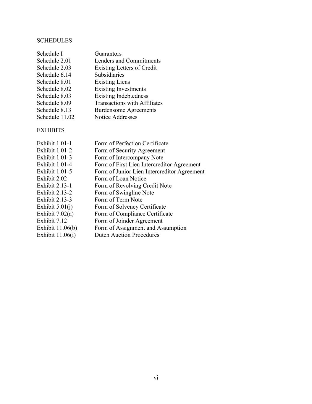 vi SCHEDULES Schedule I Guarantors Schedule 2.01 Lenders and Commitments Schedule 2.03 Existing Letters of Credit Schedule 6.14 Subsidiaries Schedule 8.01 Existing Liens Schedule 8.02 Existing Investments Schedule 8.03 Existing Indebtedness Schedule 8.09 Transactions with Affiliates Schedule 8.13 Burdensome Agreements Schedule 11.02 Notice Addresses EXHIBITS Exhibit 1.01-1 Form of Perfection Certificate Exhibit 1.01-2 Form of Security Agreement Exhibit 1.01-3 Form of Intercompany Note Exhibit 1.01-4 Form of First Lien Intercreditor Agreement Exhibit 1.01-5 Form of Junior Lien Intercreditor Agreement Exhibit 2.02 Form of Loan Notice Exhibit 2.13-1 Form of Revolving Credit Note Exhibit 2.13-2 Form of Swingline Note Exhibit 2.13-3 Form of Term Note Exhibit 5.01(j) Form of Solvency Certificate Exhibit 7.02(a) Form of Compliance Certificate Exhibit 7.12 Form of Joinder Agreement Exhibit 11.06(b) Form of Assignment and Assumption Exhibit 11.06(i) Dutch Auction Procedures