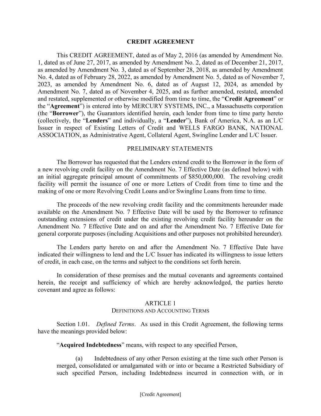 [Credit Agreement] CREDIT AGREEMENT This CREDIT AGREEMENT, dated as of May 2, 2016 (as amended by Amendment No. 1, dated as of June 27, 2017, as amended by Amendment No. 2, dated as of December 21, 2017, as amended by Amendment No. 3, dated as of September 28, 2018, as amended by Amendment No. 4, dated as of February 28, 2022, as amended by Amendment No. 5, dated as of November 7, 2023, as amended by Amendment No. 6, dated as of August 12, 2024, as amended by Amendment No. 7, dated as of November 4, 2025, and as further amended, restated, amended and restated, supplemented or otherwise modified from time to time, the “Credit Agreement” or the “Agreement”) is entered into by MERCURY SYSTEMS, INC., a Massachusetts corporation (the “Borrower”), the Guarantors identified herein, each lender from time to time party hereto (collectively, the “Lenders” and individually, a “Lender”), Bank of America, N.A. as an L/C Issuer in respect of Existing Letters of Credit and WELLS FARGO BANK, NATIONAL ASSOCIATION, as Administrative Agent, Collateral Agent, Swingline Lender and L/C Issuer. PRELIMINARY STATEMENTS The Borrower has requested that the Lenders extend credit to the Borrower in the form of a new revolving credit facility on the Amendment No. 7 Effective Date (as defined below) with an initial aggregate principal amount of commitments of $850,000,000. The revolving credit facility will permit the issuance of one or more Letters of Credit from time to time and the making of one or more Revolving Credit Loans and/or Swingline Loans from time to time. The proceeds of the new revolving credit facility and the commitments hereunder made available on the Amendment No. 7 Effective Date will be used by the Borrower to refinance outstanding extensions of credit under the existing revolving credit facility hereunder on the Amendment No. 7 Effective Date and on and after the Amendment No. 7 Effective Date for general corporate purposes (including Acquisitions and other purposes not prohibited hereunder). The Lenders party hereto on and after the Amendment No. 7 Effective Date have indicated their willingness to lend and the L/C Issuer has indicated its willingness to issue letters of credit, in each case, on the terms and subject to the conditions set forth herein. In consideration of these premises and the mutual covenants and agreements contained herein, the receipt and sufficiency of which are hereby acknowledged, the parties hereto covenant and agree as follows: ARTICLE 1 DEFINITIONS AND ACCOUNTING TERMS Section 1.01. Defined Terms. As used in this Credit Agreement, the following terms have the meanings provided below: “Acquired Indebtedness” means, with respect to any specified Person, (a) Indebtedness of any other Person existing at the time such other Person is merged, consolidated or amalgamated with or into or became a Restricted Subsidiary of such specified Person, including Indebtedness incurred in connection with, or in