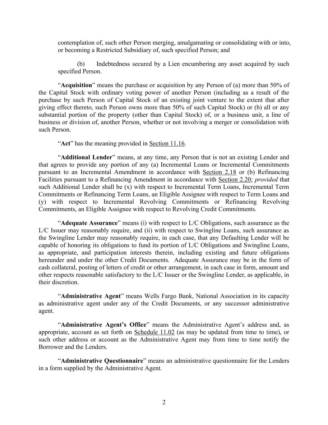 2 contemplation of, such other Person merging, amalgamating or consolidating with or into, or becoming a Restricted Subsidiary of, such specified Person; and (b) Indebtedness secured by a Lien encumbering any asset acquired by such specified Person. “Acquisition” means the purchase or acquisition by any Person of (a) more than 50% of the Capital Stock with ordinary voting power of another Person (including as a result of the purchase by such Person of Capital Stock of an existing joint venture to the extent that after giving effect thereto, such Person owns more than 50% of such Capital Stock) or (b) all or any substantial portion of the property (other than Capital Stock) of, or a business unit, a line of business or division of, another Person, whether or not involving a merger or consolidation with such Person. “Act” has the meaning provided in Section 11.16. “Additional Lender” means, at any time, any Person that is not an existing Lender and that agrees to provide any portion of any (a) Incremental Loans or Incremental Commitments pursuant to an Incremental Amendment in accordance with Section 2.18 or (b) Refinancing Facilities pursuant to a Refinancing Amendment in accordance with Section 2.20; provided that such Additional Lender shall be (x) with respect to Incremental Term Loans, Incremental Term Commitments or Refinancing Term Loans, an Eligible Assignee with respect to Term Loans and (y) with respect to Incremental Revolving Commitments or Refinancing Revolving Commitments, an Eligible Assignee with respect to Revolving Credit Commitments. “Adequate Assurance” means (i) with respect to L/C Obligations, such assurance as the L/C Issuer may reasonably require, and (ii) with respect to Swingline Loans, such assurance as the Swingline Lender may reasonably require, in each case, that any Defaulting Lender will be capable of honoring its obligations to fund its portion of L/C Obligations and Swingline Loans, as appropriate, and participation interests therein, including existing and future obligations hereunder and under the other Credit Documents. Adequate Assurance may be in the form of cash collateral, posting of letters of credit or other arrangement, in each case in form, amount and other respects reasonable satisfactory to the L/C Issuer or the Swingline Lender, as applicable, in their discretion. “Administrative Agent” means Wells Fargo Bank, National Association in its capacity as administrative agent under any of the Credit Documents, or any successor administrative agent. “Administrative Agent’s Office” means the Administrative Agent’s address and, as appropriate, account as set forth on Schedule 11.02 (as may be updated from time to time), or such other address or account as the Administrative Agent may from time to time notify the Borrower and the Lenders. “Administrative Questionnaire” means an administrative questionnaire for the Lenders in a form supplied by the Administrative Agent.