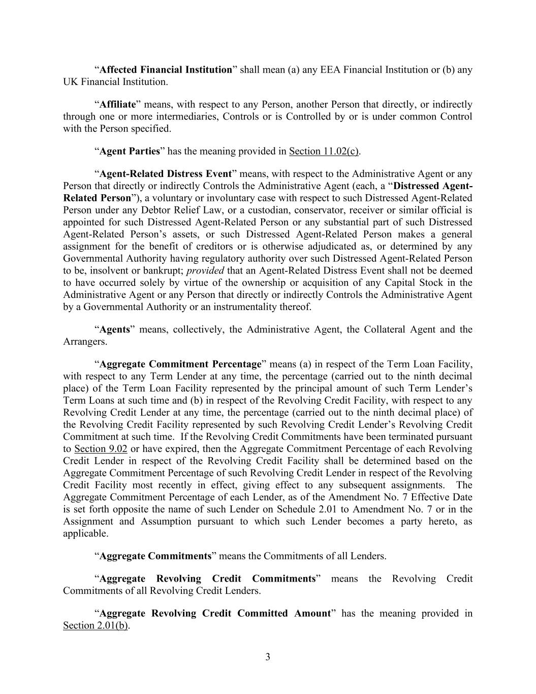 3 “Affected Financial Institution” shall mean (a) any EEA Financial Institution or (b) any UK Financial Institution. “Affiliate” means, with respect to any Person, another Person that directly, or indirectly through one or more intermediaries, Controls or is Controlled by or is under common Control with the Person specified. “Agent Parties” has the meaning provided in Section 11.02(c). “Agent-Related Distress Event” means, with respect to the Administrative Agent or any Person that directly or indirectly Controls the Administrative Agent (each, a “Distressed Agent- Related Person”), a voluntary or involuntary case with respect to such Distressed Agent-Related Person under any Debtor Relief Law, or a custodian, conservator, receiver or similar official is appointed for such Distressed Agent-Related Person or any substantial part of such Distressed Agent-Related Person’s assets, or such Distressed Agent-Related Person makes a general assignment for the benefit of creditors or is otherwise adjudicated as, or determined by any Governmental Authority having regulatory authority over such Distressed Agent-Related Person to be, insolvent or bankrupt; provided that an Agent-Related Distress Event shall not be deemed to have occurred solely by virtue of the ownership or acquisition of any Capital Stock in the Administrative Agent or any Person that directly or indirectly Controls the Administrative Agent by a Governmental Authority or an instrumentality thereof. “Agents” means, collectively, the Administrative Agent, the Collateral Agent and the Arrangers. “Aggregate Commitment Percentage” means (a) in respect of the Term Loan Facility, with respect to any Term Lender at any time, the percentage (carried out to the ninth decimal place) of the Term Loan Facility represented by the principal amount of such Term Lender’s Term Loans at such time and (b) in respect of the Revolving Credit Facility, with respect to any Revolving Credit Lender at any time, the percentage (carried out to the ninth decimal place) of the Revolving Credit Facility represented by such Revolving Credit Lender’s Revolving Credit Commitment at such time. If the Revolving Credit Commitments have been terminated pursuant to Section 9.02 or have expired, then the Aggregate Commitment Percentage of each Revolving Credit Lender in respect of the Revolving Credit Facility shall be determined based on the Aggregate Commitment Percentage of such Revolving Credit Lender in respect of the Revolving Credit Facility most recently in effect, giving effect to any subsequent assignments. The Aggregate Commitment Percentage of each Lender, as of the Amendment No. 7 Effective Date is set forth opposite the name of such Lender on Schedule 2.01 to Amendment No. 7 or in the Assignment and Assumption pursuant to which such Lender becomes a party hereto, as applicable. “Aggregate Commitments” means the Commitments of all Lenders. “Aggregate Revolving Credit Commitments” means the Revolving Credit Commitments of all Revolving Credit Lenders. “Aggregate Revolving Credit Committed Amount” has the meaning provided in Section 2.01(b).