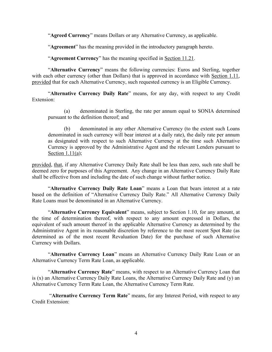 4 “Agreed Currency” means Dollars or any Alternative Currency, as applicable. “Agreement” has the meaning provided in the introductory paragraph hereto. “Agreement Currency” has the meaning specified in Section 11.21. “Alternative Currency” means the following currencies: Euros and Sterling, together with each other currency (other than Dollars) that is approved in accordance with Section 1.11, provided that for each Alternative Currency, such requested currency is an Eligible Currency. “Alternative Currency Daily Rate” means, for any day, with respect to any Credit Extension: (a) denominated in Sterling, the rate per annum equal to SONIA determined pursuant to the definition thereof; and (b) denominated in any other Alternative Currency (to the extent such Loans denominated in such currency will bear interest at a daily rate), the daily rate per annum as designated with respect to such Alternative Currency at the time such Alternative Currency is approved by the Administrative Agent and the relevant Lenders pursuant to Section 1.11(a); provided, that, if any Alternative Currency Daily Rate shall be less than zero, such rate shall be deemed zero for purposes of this Agreement. Any change in an Alternative Currency Daily Rate shall be effective from and including the date of such change without further notice. “Alternative Currency Daily Rate Loan” means a Loan that bears interest at a rate based on the definition of “Alternative Currency Daily Rate.” All Alternative Currency Daily Rate Loans must be denominated in an Alternative Currency. “Alternative Currency Equivalent” means, subject to Section 1.10, for any amount, at the time of determination thereof, with respect to any amount expressed in Dollars, the equivalent of such amount thereof in the applicable Alternative Currency as determined by the Administrative Agent in its reasonable discretion by reference to the most recent Spot Rate (as determined as of the most recent Revaluation Date) for the purchase of such Alternative Currency with Dollars. “Alternative Currency Loan” means an Alternative Currency Daily Rate Loan or an Alternative Currency Term Rate Loan, as applicable. “Alternative Currency Rate” means, with respect to an Alternative Currency Loan that is (x) an Alternative Currency Daily Rate Loans, the Alternative Currency Daily Rate and (y) an Alternative Currency Term Rate Loan, the Alternative Currency Term Rate. “Alternative Currency Term Rate” means, for any Interest Period, with respect to any Credit Extension: