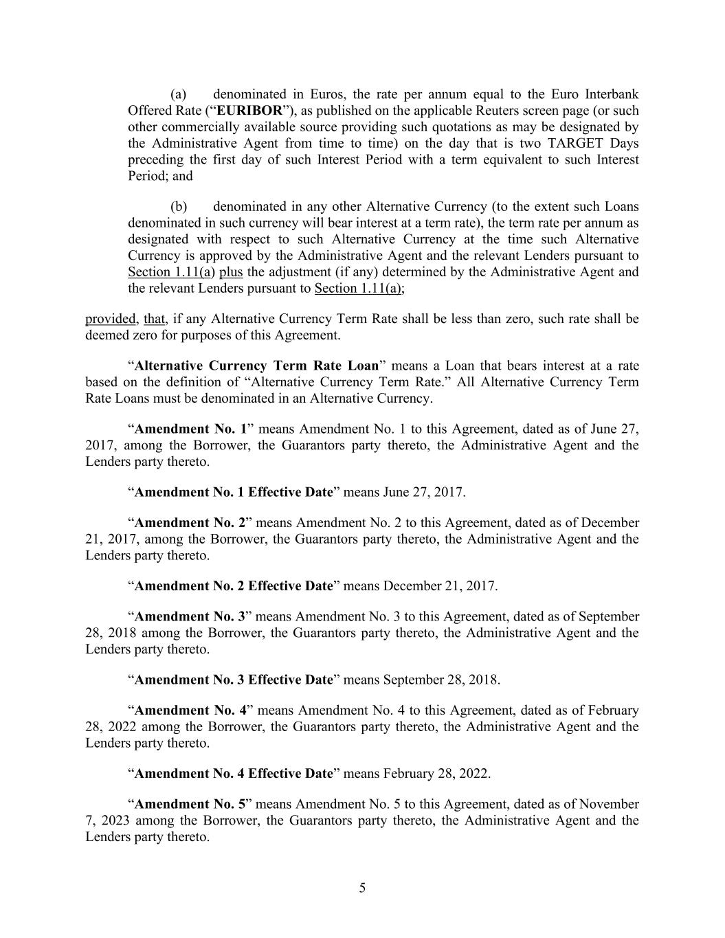 5 (a) denominated in Euros, the rate per annum equal to the Euro Interbank Offered Rate (“EURIBOR”), as published on the applicable Reuters screen page (or such other commercially available source providing such quotations as may be designated by the Administrative Agent from time to time) on the day that is two TARGET Days preceding the first day of such Interest Period with a term equivalent to such Interest Period; and (b) denominated in any other Alternative Currency (to the extent such Loans denominated in such currency will bear interest at a term rate), the term rate per annum as designated with respect to such Alternative Currency at the time such Alternative Currency is approved by the Administrative Agent and the relevant Lenders pursuant to Section 1.11(a) plus the adjustment (if any) determined by the Administrative Agent and the relevant Lenders pursuant to Section 1.11(a); provided, that, if any Alternative Currency Term Rate shall be less than zero, such rate shall be deemed zero for purposes of this Agreement. “Alternative Currency Term Rate Loan” means a Loan that bears interest at a rate based on the definition of “Alternative Currency Term Rate.” All Alternative Currency Term Rate Loans must be denominated in an Alternative Currency. “Amendment No. 1” means Amendment No. 1 to this Agreement, dated as of June 27, 2017, among the Borrower, the Guarantors party thereto, the Administrative Agent and the Lenders party thereto. “Amendment No. 1 Effective Date” means June 27, 2017. “Amendment No. 2” means Amendment No. 2 to this Agreement, dated as of December 21, 2017, among the Borrower, the Guarantors party thereto, the Administrative Agent and the Lenders party thereto. “Amendment No. 2 Effective Date” means December 21, 2017. “Amendment No. 3” means Amendment No. 3 to this Agreement, dated as of September 28, 2018 among the Borrower, the Guarantors party thereto, the Administrative Agent and the Lenders party thereto. “Amendment No. 3 Effective Date” means September 28, 2018. “Amendment No. 4” means Amendment No. 4 to this Agreement, dated as of February 28, 2022 among the Borrower, the Guarantors party thereto, the Administrative Agent and the Lenders party thereto. “Amendment No. 4 Effective Date” means February 28, 2022. “Amendment No. 5” means Amendment No. 5 to this Agreement, dated as of November 7, 2023 among the Borrower, the Guarantors party thereto, the Administrative Agent and the Lenders party thereto.