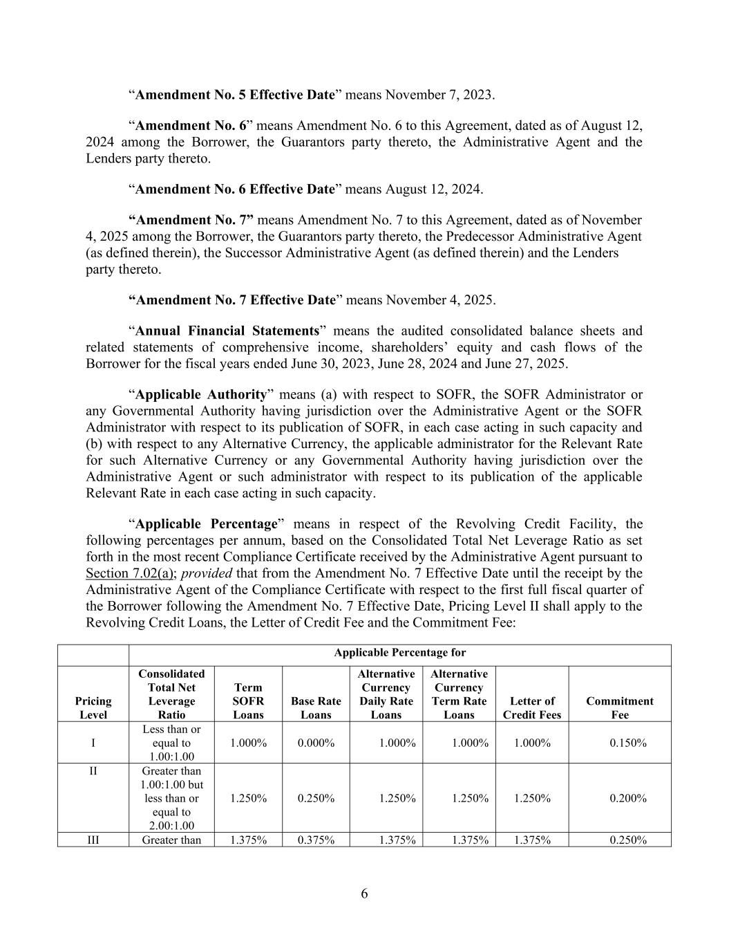 6 “Amendment No. 5 Effective Date” means November 7, 2023. “Amendment No. 6” means Amendment No. 6 to this Agreement, dated as of August 12, 2024 among the Borrower, the Guarantors party thereto, the Administrative Agent and the Lenders party thereto. “Amendment No. 6 Effective Date” means August 12, 2024. “Amendment No. 7” means Amendment No. 7 to this Agreement, dated as of November 4, 2025 among the Borrower, the Guarantors party thereto, the Predecessor Administrative Agent (as defined therein), the Successor Administrative Agent (as defined therein) and the Lenders party thereto. “Amendment No. 7 Effective Date” means November 4, 2025. “Annual Financial Statements” means the audited consolidated balance sheets and related statements of comprehensive income, shareholders’ equity and cash flows of the Borrower for the fiscal years ended June 30, 2023, June 28, 2024 and June 27, 2025. “Applicable Authority” means (a) with respect to SOFR, the SOFR Administrator or any Governmental Authority having jurisdiction over the Administrative Agent or the SOFR Administrator with respect to its publication of SOFR, in each case acting in such capacity and (b) with respect to any Alternative Currency, the applicable administrator for the Relevant Rate for such Alternative Currency or any Governmental Authority having jurisdiction over the Administrative Agent or such administrator with respect to its publication of the applicable Relevant Rate in each case acting in such capacity. “Applicable Percentage” means in respect of the Revolving Credit Facility, the following percentages per annum, based on the Consolidated Total Net Leverage Ratio as set forth in the most recent Compliance Certificate received by the Administrative Agent pursuant to Section 7.02(a); provided that from the Amendment No. 7 Effective Date until the receipt by the Administrative Agent of the Compliance Certificate with respect to the first full fiscal quarter of the Borrower following the Amendment No. 7 Effective Date, Pricing Level II shall apply to the Revolving Credit Loans, the Letter of Credit Fee and the Commitment Fee: Applicable Percentage for Pricing Level Consolidated Total Net Leverage Ratio Term SOFR Loans Base Rate Loans Alternative Currency Daily Rate Loans Alternative Currency Term Rate Loans Letter of Credit Fees Commitment Fee I Less than or equal to 1.00:1.00 1.000% 0.000% 1.000% 1.000% 1.000% 0.150% II Greater than 1.00:1.00 but less than or equal to 2.00:1.00 1.250% 0.250% 1.250% 1.250% 1.250% 0.200% III Greater than 1.375% 0.375% 1.375% 1.375% 1.375% 0.250%