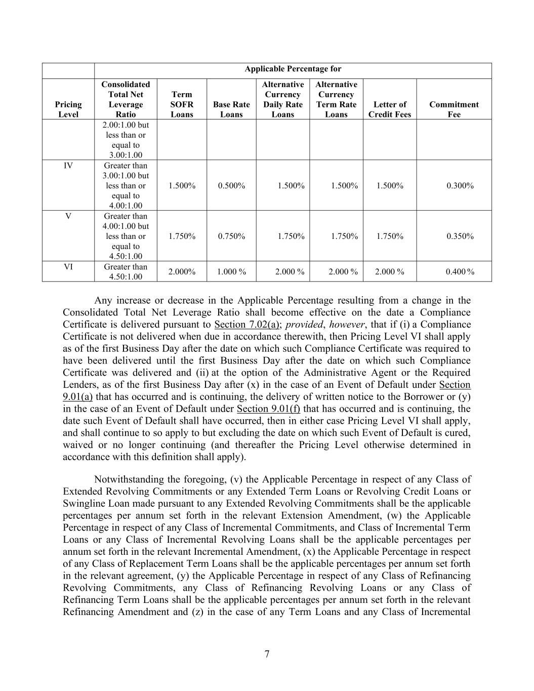 7 Applicable Percentage for Pricing Level Consolidated Total Net Leverage Ratio Term SOFR Loans Base Rate Loans Alternative Currency Daily Rate Loans Alternative Currency Term Rate Loans Letter of Credit Fees Commitment Fee 2.00:1.00 but less than or equal to 3.00:1.00 IV Greater than 3.00:1.00 but less than or equal to 4.00:1.00 1.500% 0.500% 1.500% 1.500% 1.500% 0.300% V Greater than 4.00:1.00 but less than or equal to 4.50:1.00 1.750% 0.750% 1.750% 1.750% 1.750% 0.350% VI Greater than 4.50:1.00 2.000% 1.000 % 2.000 % 2.000 % 2.000 % 0.400 % Any increase or decrease in the Applicable Percentage resulting from a change in the Consolidated Total Net Leverage Ratio shall become effective on the date a Compliance Certificate is delivered pursuant to Section 7.02(a); provided, however, that if (i) a Compliance Certificate is not delivered when due in accordance therewith, then Pricing Level VI shall apply as of the first Business Day after the date on which such Compliance Certificate was required to have been delivered until the first Business Day after the date on which such Compliance Certificate was delivered and (ii) at the option of the Administrative Agent or the Required Lenders, as of the first Business Day after (x) in the case of an Event of Default under Section 9.01(a) that has occurred and is continuing, the delivery of written notice to the Borrower or (y) in the case of an Event of Default under Section 9.01(f) that has occurred and is continuing, the date such Event of Default shall have occurred, then in either case Pricing Level VI shall apply, and shall continue to so apply to but excluding the date on which such Event of Default is cured, waived or no longer continuing (and thereafter the Pricing Level otherwise determined in accordance with this definition shall apply). Notwithstanding the foregoing, (v) the Applicable Percentage in respect of any Class of Extended Revolving Commitments or any Extended Term Loans or Revolving Credit Loans or Swingline Loan made pursuant to any Extended Revolving Commitments shall be the applicable percentages per annum set forth in the relevant Extension Amendment, (w) the Applicable Percentage in respect of any Class of Incremental Commitments, and Class of Incremental Term Loans or any Class of Incremental Revolving Loans shall be the applicable percentages per annum set forth in the relevant Incremental Amendment, (x) the Applicable Percentage in respect of any Class of Replacement Term Loans shall be the applicable percentages per annum set forth in the relevant agreement, (y) the Applicable Percentage in respect of any Class of Refinancing Revolving Commitments, any Class of Refinancing Revolving Loans or any Class of Refinancing Term Loans shall be the applicable percentages per annum set forth in the relevant Refinancing Amendment and (z) in the case of any Term Loans and any Class of Incremental