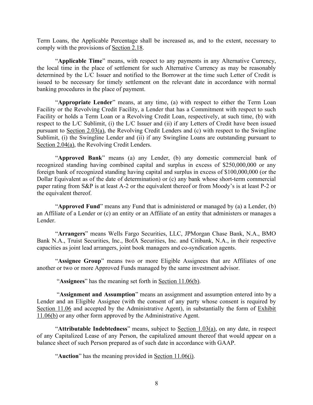 8 Term Loans, the Applicable Percentage shall be increased as, and to the extent, necessary to comply with the provisions of Section 2.18. “Applicable Time” means, with respect to any payments in any Alternative Currency, the local time in the place of settlement for such Alternative Currency as may be reasonably determined by the L/C Issuer and notified to the Borrower at the time such Letter of Credit is issued to be necessary for timely settlement on the relevant date in accordance with normal banking procedures in the place of payment. “Appropriate Lender” means, at any time, (a) with respect to either the Term Loan Facility or the Revolving Credit Facility, a Lender that has a Commitment with respect to such Facility or holds a Term Loan or a Revolving Credit Loan, respectively, at such time, (b) with respect to the L/C Sublimit, (i) the L/C Issuer and (ii) if any Letters of Credit have been issued pursuant to Section 2.03(a), the Revolving Credit Lenders and (c) with respect to the Swingline Sublimit, (i) the Swingline Lender and (ii) if any Swingline Loans are outstanding pursuant to Section 2.04(a), the Revolving Credit Lenders. “Approved Bank” means (a) any Lender, (b) any domestic commercial bank of recognized standing having combined capital and surplus in excess of $250,000,000 or any foreign bank of recognized standing having capital and surplus in excess of $100,000,000 (or the Dollar Equivalent as of the date of determination) or (c) any bank whose short-term commercial paper rating from S&P is at least A-2 or the equivalent thereof or from Moody’s is at least P-2 or the equivalent thereof. “Approved Fund” means any Fund that is administered or managed by (a) a Lender, (b) an Affiliate of a Lender or (c) an entity or an Affiliate of an entity that administers or manages a Lender. “Arrangers” means Wells Fargo Securities, LLC, JPMorgan Chase Bank, N.A., BMO Bank N.A., Truist Securities, Inc., BofA Securities, Inc. and Citibank, N.A., in their respective capacities as joint lead arrangers, joint book managers and co-syndication agents. “Assignee Group” means two or more Eligible Assignees that are Affiliates of one another or two or more Approved Funds managed by the same investment advisor. “Assignees” has the meaning set forth in Section 11.06(b). “Assignment and Assumption” means an assignment and assumption entered into by a Lender and an Eligible Assignee (with the consent of any party whose consent is required by Section 11.06 and accepted by the Administrative Agent), in substantially the form of Exhibit 11.06(b) or any other form approved by the Administrative Agent. “Attributable Indebtedness” means, subject to Section 1.03(a), on any date, in respect of any Capitalized Lease of any Person, the capitalized amount thereof that would appear on a balance sheet of such Person prepared as of such date in accordance with GAAP. “Auction” has the meaning provided in Section 11.06(i).