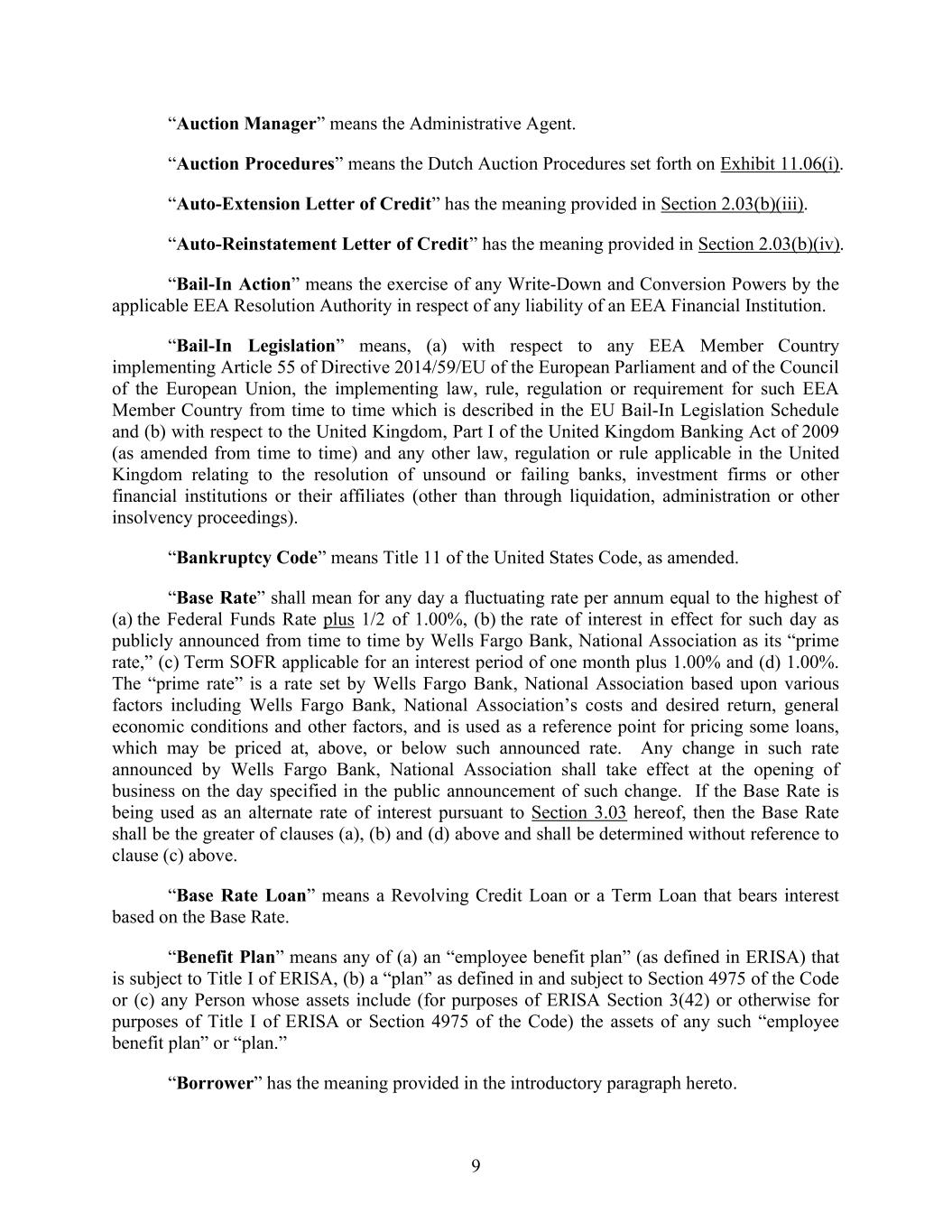 9 “Auction Manager” means the Administrative Agent. “Auction Procedures” means the Dutch Auction Procedures set forth on Exhibit 11.06(i). “Auto-Extension Letter of Credit” has the meaning provided in Section 2.03(b)(iii). “Auto-Reinstatement Letter of Credit” has the meaning provided in Section 2.03(b)(iv). “Bail-In Action” means the exercise of any Write-Down and Conversion Powers by the applicable EEA Resolution Authority in respect of any liability of an EEA Financial Institution. “Bail-In Legislation” means, (a) with respect to any EEA Member Country implementing Article 55 of Directive 2014/59/EU of the European Parliament and of the Council of the European Union, the implementing law, rule, regulation or requirement for such EEA Member Country from time to time which is described in the EU Bail-In Legislation Schedule and (b) with respect to the United Kingdom, Part I of the United Kingdom Banking Act of 2009 (as amended from time to time) and any other law, regulation or rule applicable in the United Kingdom relating to the resolution of unsound or failing banks, investment firms or other financial institutions or their affiliates (other than through liquidation, administration or other insolvency proceedings). “Bankruptcy Code” means Title 11 of the United States Code, as amended. “Base Rate” shall mean for any day a fluctuating rate per annum equal to the highest of (a) the Federal Funds Rate plus 1/2 of 1.00%, (b) the rate of interest in effect for such day as publicly announced from time to time by Wells Fargo Bank, National Association as its “prime rate,” (c) Term SOFR applicable for an interest period of one month plus 1.00% and (d) 1.00%. The “prime rate” is a rate set by Wells Fargo Bank, National Association based upon various factors including Wells Fargo Bank, National Association’s costs and desired return, general economic conditions and other factors, and is used as a reference point for pricing some loans, which may be priced at, above, or below such announced rate. Any change in such rate announced by Wells Fargo Bank, National Association shall take effect at the opening of business on the day specified in the public announcement of such change. If the Base Rate is being used as an alternate rate of interest pursuant to Section 3.03 hereof, then the Base Rate shall be the greater of clauses (a), (b) and (d) above and shall be determined without reference to clause (c) above. “Base Rate Loan” means a Revolving Credit Loan or a Term Loan that bears interest based on the Base Rate. “Benefit Plan” means any of (a) an “employee benefit plan” (as defined in ERISA) that is subject to Title I of ERISA, (b) a “plan” as defined in and subject to Section 4975 of the Code or (c) any Person whose assets include (for purposes of ERISA Section 3(42) or otherwise for purposes of Title I of ERISA or Section 4975 of the Code) the assets of any such “employee benefit plan” or “plan.” “Borrower” has the meaning provided in the introductory paragraph hereto.