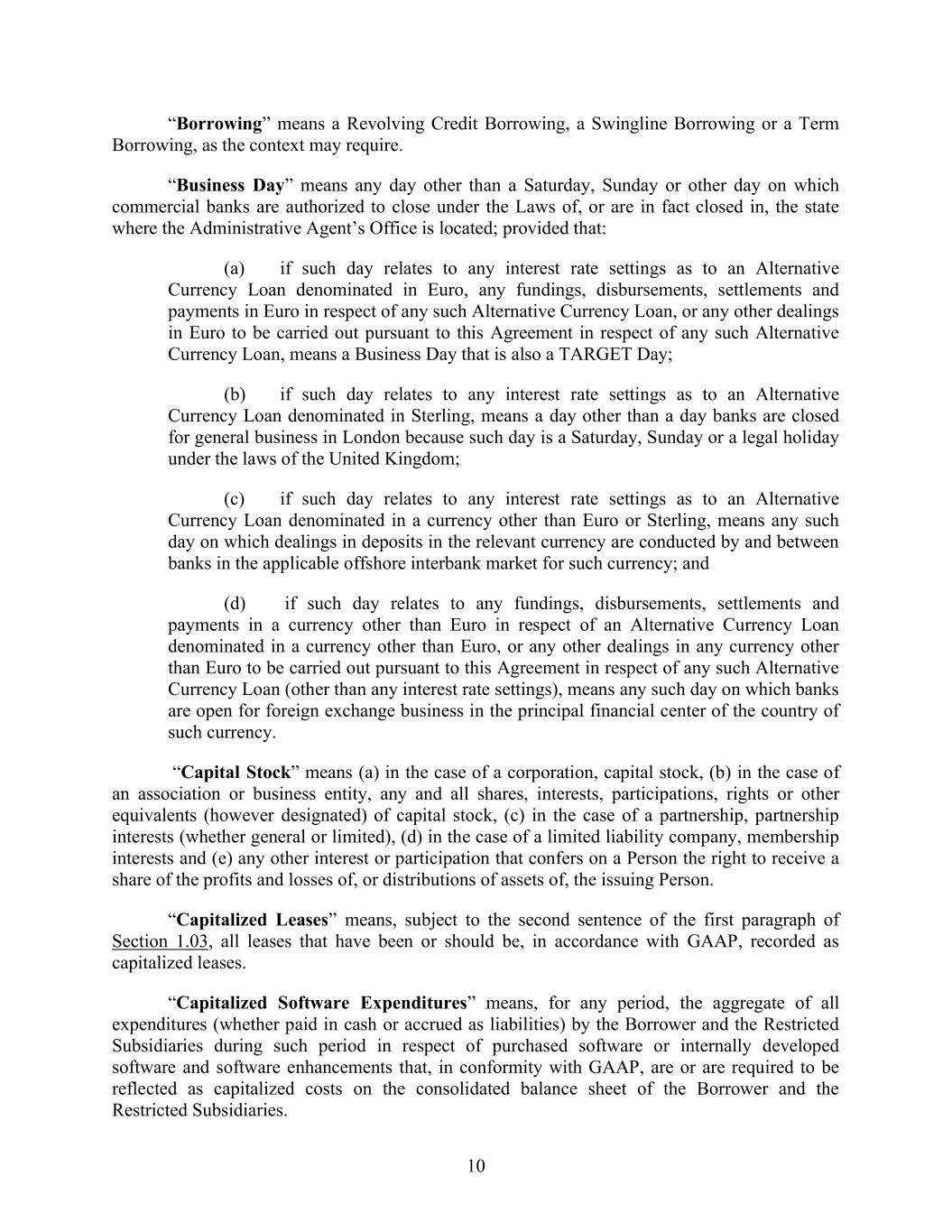 10 “Borrowing” means a Revolving Credit Borrowing, a Swingline Borrowing or a Term Borrowing, as the context may require. “Business Day” means any day other than a Saturday, Sunday or other day on which commercial banks are authorized to close under the Laws of, or are in fact closed in, the state where the Administrative Agent’s Office is located; provided that: (a) if such day relates to any interest rate settings as to an Alternative Currency Loan denominated in Euro, any fundings, disbursements, settlements and payments in Euro in respect of any such Alternative Currency Loan, or any other dealings in Euro to be carried out pursuant to this Agreement in respect of any such Alternative Currency Loan, means a Business Day that is also a TARGET Day; (b) if such day relates to any interest rate settings as to an Alternative Currency Loan denominated in Sterling, means a day other than a day banks are closed for general business in London because such day is a Saturday, Sunday or a legal holiday under the laws of the United Kingdom; (c) if such day relates to any interest rate settings as to an Alternative Currency Loan denominated in a currency other than Euro or Sterling, means any such day on which dealings in deposits in the relevant currency are conducted by and between banks in the applicable offshore interbank market for such currency; and (d) if such day relates to any fundings, disbursements, settlements and payments in a currency other than Euro in respect of an Alternative Currency Loan denominated in a currency other than Euro, or any other dealings in any currency other than Euro to be carried out pursuant to this Agreement in respect of any such Alternative Currency Loan (other than any interest rate settings), means any such day on which banks are open for foreign exchange business in the principal financial center of the country of such currency. “Capital Stock” means (a) in the case of a corporation, capital stock, (b) in the case of an association or business entity, any and all shares, interests, participations, rights or other equivalents (however designated) of capital stock, (c) in the case of a partnership, partnership interests (whether general or limited), (d) in the case of a limited liability company, membership interests and (e) any other interest or participation that confers on a Person the right to receive a share of the profits and losses of, or distributions of assets of, the issuing Person. “Capitalized Leases” means, subject to the second sentence of the first paragraph of Section 1.03, all leases that have been or should be, in accordance with GAAP, recorded as capitalized leases. “Capitalized Software Expenditures” means, for any period, the aggregate of all expenditures (whether paid in cash or accrued as liabilities) by the Borrower and the Restricted Subsidiaries during such period in respect of purchased software or internally developed software and software enhancements that, in conformity with GAAP, are or are required to be reflected as capitalized costs on the consolidated balance sheet of the Borrower and the Restricted Subsidiaries.