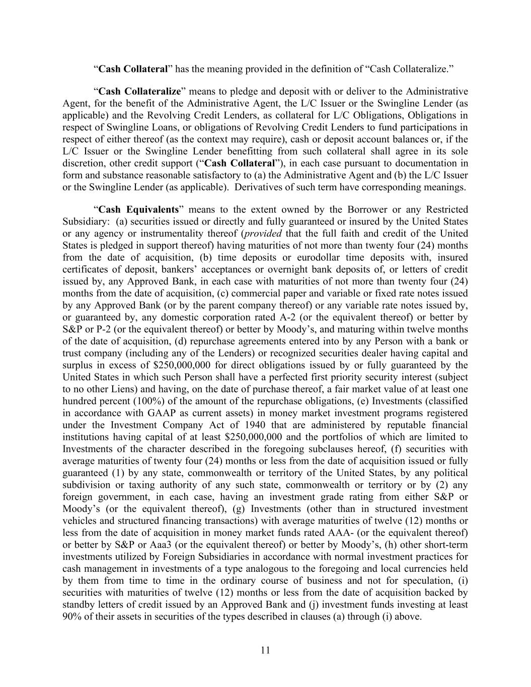 11 “Cash Collateral” has the meaning provided in the definition of “Cash Collateralize.” “Cash Collateralize” means to pledge and deposit with or deliver to the Administrative Agent, for the benefit of the Administrative Agent, the L/C Issuer or the Swingline Lender (as applicable) and the Revolving Credit Lenders, as collateral for L/C Obligations, Obligations in respect of Swingline Loans, or obligations of Revolving Credit Lenders to fund participations in respect of either thereof (as the context may require), cash or deposit account balances or, if the L/C Issuer or the Swingline Lender benefitting from such collateral shall agree in its sole discretion, other credit support (“Cash Collateral”), in each case pursuant to documentation in form and substance reasonable satisfactory to (a) the Administrative Agent and (b) the L/C Issuer or the Swingline Lender (as applicable). Derivatives of such term have corresponding meanings. “Cash Equivalents” means to the extent owned by the Borrower or any Restricted Subsidiary: (a) securities issued or directly and fully guaranteed or insured by the United States or any agency or instrumentality thereof (provided that the full faith and credit of the United States is pledged in support thereof) having maturities of not more than twenty four (24) months from the date of acquisition, (b) time deposits or eurodollar time deposits with, insured certificates of deposit, bankers’ acceptances or overnight bank deposits of, or letters of credit issued by, any Approved Bank, in each case with maturities of not more than twenty four (24) months from the date of acquisition, (c) commercial paper and variable or fixed rate notes issued by any Approved Bank (or by the parent company thereof) or any variable rate notes issued by, or guaranteed by, any domestic corporation rated A-2 (or the equivalent thereof) or better by S&P or P-2 (or the equivalent thereof) or better by Moody’s, and maturing within twelve months of the date of acquisition, (d) repurchase agreements entered into by any Person with a bank or trust company (including any of the Lenders) or recognized securities dealer having capital and surplus in excess of $250,000,000 for direct obligations issued by or fully guaranteed by the United States in which such Person shall have a perfected first priority security interest (subject to no other Liens) and having, on the date of purchase thereof, a fair market value of at least one hundred percent (100%) of the amount of the repurchase obligations, (e) Investments (classified in accordance with GAAP as current assets) in money market investment programs registered under the Investment Company Act of 1940 that are administered by reputable financial institutions having capital of at least $250,000,000 and the portfolios of which are limited to Investments of the character described in the foregoing subclauses hereof, (f) securities with average maturities of twenty four (24) months or less from the date of acquisition issued or fully guaranteed (1) by any state, commonwealth or territory of the United States, by any political subdivision or taxing authority of any such state, commonwealth or territory or by (2) any foreign government, in each case, having an investment grade rating from either S&P or Moody’s (or the equivalent thereof), (g) Investments (other than in structured investment vehicles and structured financing transactions) with average maturities of twelve (12) months or less from the date of acquisition in money market funds rated AAA- (or the equivalent thereof) or better by S&P or Aaa3 (or the equivalent thereof) or better by Moody’s, (h) other short-term investments utilized by Foreign Subsidiaries in accordance with normal investment practices for cash management in investments of a type analogous to the foregoing and local currencies held by them from time to time in the ordinary course of business and not for speculation, (i) securities with maturities of twelve (12) months or less from the date of acquisition backed by standby letters of credit issued by an Approved Bank and (j) investment funds investing at least 90% of their assets in securities of the types described in clauses (a) through (i) above.