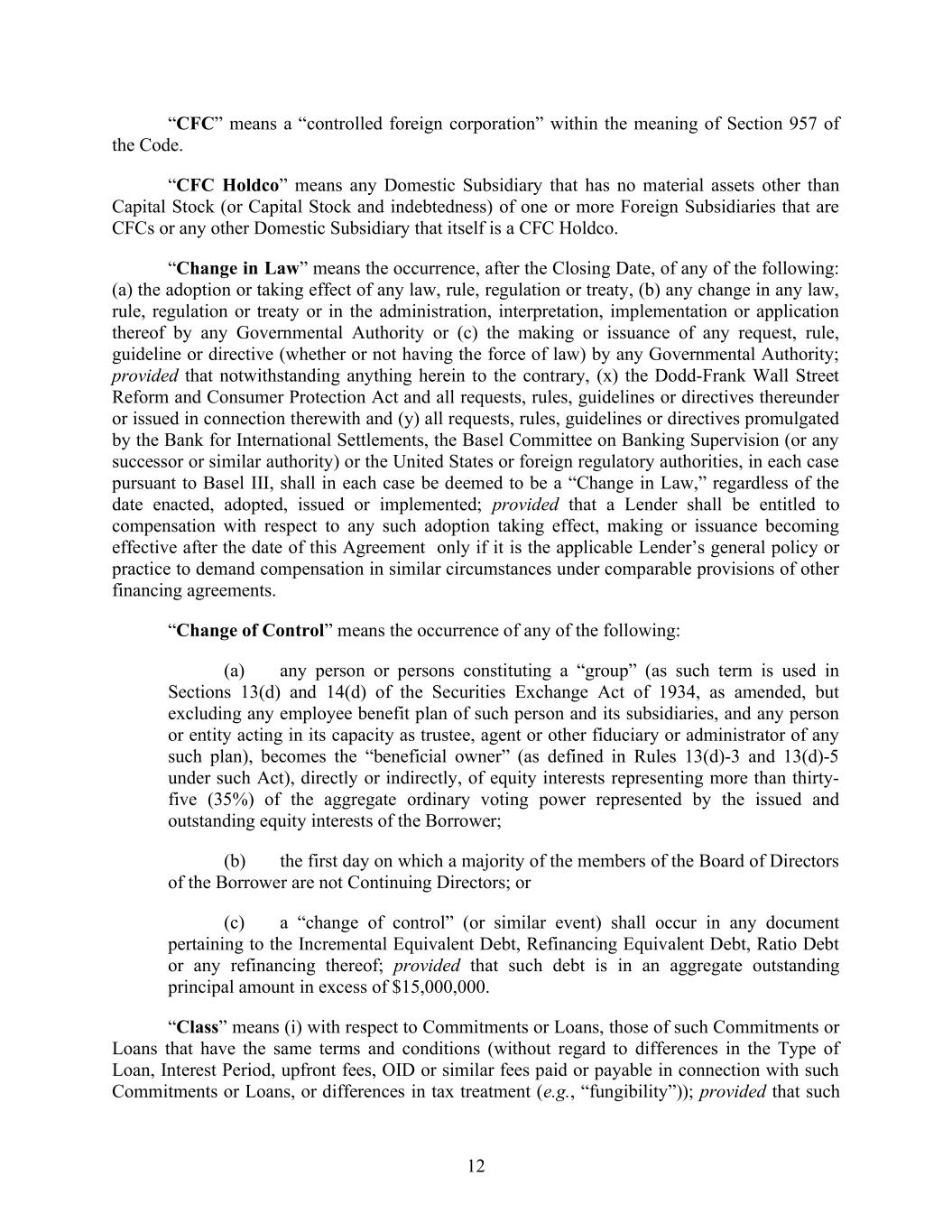 12 “CFC” means a “controlled foreign corporation” within the meaning of Section 957 of the Code. “CFC Holdco” means any Domestic Subsidiary that has no material assets other than Capital Stock (or Capital Stock and indebtedness) of one or more Foreign Subsidiaries that are CFCs or any other Domestic Subsidiary that itself is a CFC Holdco. “Change in Law” means the occurrence, after the Closing Date, of any of the following: (a) the adoption or taking effect of any law, rule, regulation or treaty, (b) any change in any law, rule, regulation or treaty or in the administration, interpretation, implementation or application thereof by any Governmental Authority or (c) the making or issuance of any request, rule, guideline or directive (whether or not having the force of law) by any Governmental Authority; provided that notwithstanding anything herein to the contrary, (x) the Dodd-Frank Wall Street Reform and Consumer Protection Act and all requests, rules, guidelines or directives thereunder or issued in connection therewith and (y) all requests, rules, guidelines or directives promulgated by the Bank for International Settlements, the Basel Committee on Banking Supervision (or any successor or similar authority) or the United States or foreign regulatory authorities, in each case pursuant to Basel III, shall in each case be deemed to be a “Change in Law,” regardless of the date enacted, adopted, issued or implemented; provided that a Lender shall be entitled to compensation with respect to any such adoption taking effect, making or issuance becoming effective after the date of this Agreement only if it is the applicable Lender’s general policy or practice to demand compensation in similar circumstances under comparable provisions of other financing agreements. “Change of Control” means the occurrence of any of the following: (a) any person or persons constituting a “group” (as such term is used in Sections 13(d) and 14(d) of the Securities Exchange Act of 1934, as amended, but excluding any employee benefit plan of such person and its subsidiaries, and any person or entity acting in its capacity as trustee, agent or other fiduciary or administrator of any such plan), becomes the “beneficial owner” (as defined in Rules 13(d)-3 and 13(d)-5 under such Act), directly or indirectly, of equity interests representing more than thirty- five (35%) of the aggregate ordinary voting power represented by the issued and outstanding equity interests of the Borrower; (b) the first day on which a majority of the members of the Board of Directors of the Borrower are not Continuing Directors; or (c) a “change of control” (or similar event) shall occur in any document pertaining to the Incremental Equivalent Debt, Refinancing Equivalent Debt, Ratio Debt or any refinancing thereof; provided that such debt is in an aggregate outstanding principal amount in excess of $15,000,000. “Class” means (i) with respect to Commitments or Loans, those of such Commitments or Loans that have the same terms and conditions (without regard to differences in the Type of Loan, Interest Period, upfront fees, OID or similar fees paid or payable in connection with such Commitments or Loans, or differences in tax treatment (e.g., “fungibility”)); provided that such