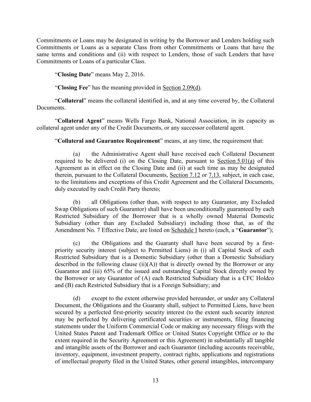13 Commitments or Loans may be designated in writing by the Borrower and Lenders holding such Commitments or Loans as a separate Class from other Commitments or Loans that have the same terms and conditions and (ii) with respect to Lenders, those of such Lenders that have Commitments or Loans of a particular Class. “Closing Date” means May 2, 2016. “Closing Fee” has the meaning provided in Section 2.09(d). “Collateral” means the collateral identified in, and at any time covered by, the Collateral Documents. “Collateral Agent” means Wells Fargo Bank, National Association, in its capacity as collateral agent under any of the Credit Documents, or any successor collateral agent. “Collateral and Guarantee Requirement” means, at any time, the requirement that: (a) the Administrative Agent shall have received each Collateral Document required to be delivered (i) on the Closing Date, pursuant to Section 5.01(a) of this Agreement as in effect on the Closing Date and (ii) at such time as may be designated therein, pursuant to the Collateral Documents, Section 7.12 or 7.13, subject, in each case, to the limitations and exceptions of this Credit Agreement and the Collateral Documents, duly executed by each Credit Party thereto; (b) all Obligations (other than, with respect to any Guarantor, any Excluded Swap Obligations of such Guarantor) shall have been unconditionally guaranteed by each Restricted Subsidiary of the Borrower that is a wholly owned Material Domestic Subsidiary (other than any Excluded Subsidiary) including those that, as of the Amendment No. 7 Effective Date, are listed on Schedule I hereto (each, a “Guarantor”); (c) the Obligations and the Guaranty shall have been secured by a first- priority security interest (subject to Permitted Liens) in (i) all Capital Stock of each Restricted Subsidiary that is a Domestic Subsidiary (other than a Domestic Subsidiary described in the following clause (ii)(A)) that is directly owned by the Borrower or any Guarantor and (iii) 65% of the issued and outstanding Capital Stock directly owned by the Borrower or any Guarantor of (A) each Restricted Subsidiary that is a CFC Holdco and (B) each Restricted Subsidiary that is a Foreign Subsidiary; and (d) except to the extent otherwise provided hereunder, or under any Collateral Document, the Obligations and the Guaranty shall, subject to Permitted Liens, have been secured by a perfected first-priority security interest (to the extent such security interest may be perfected by delivering certificated securities or instruments, filing financing statements under the Uniform Commercial Code or making any necessary filings with the United States Patent and Trademark Office or United States Copyright Office or to the extent required in the Security Agreement or this Agreement) in substantially all tangible and intangible assets of the Borrower and each Guarantor (including accounts receivable, inventory, equipment, investment property, contract rights, applications and registrations of intellectual property filed in the United States, other general intangibles, intercompany