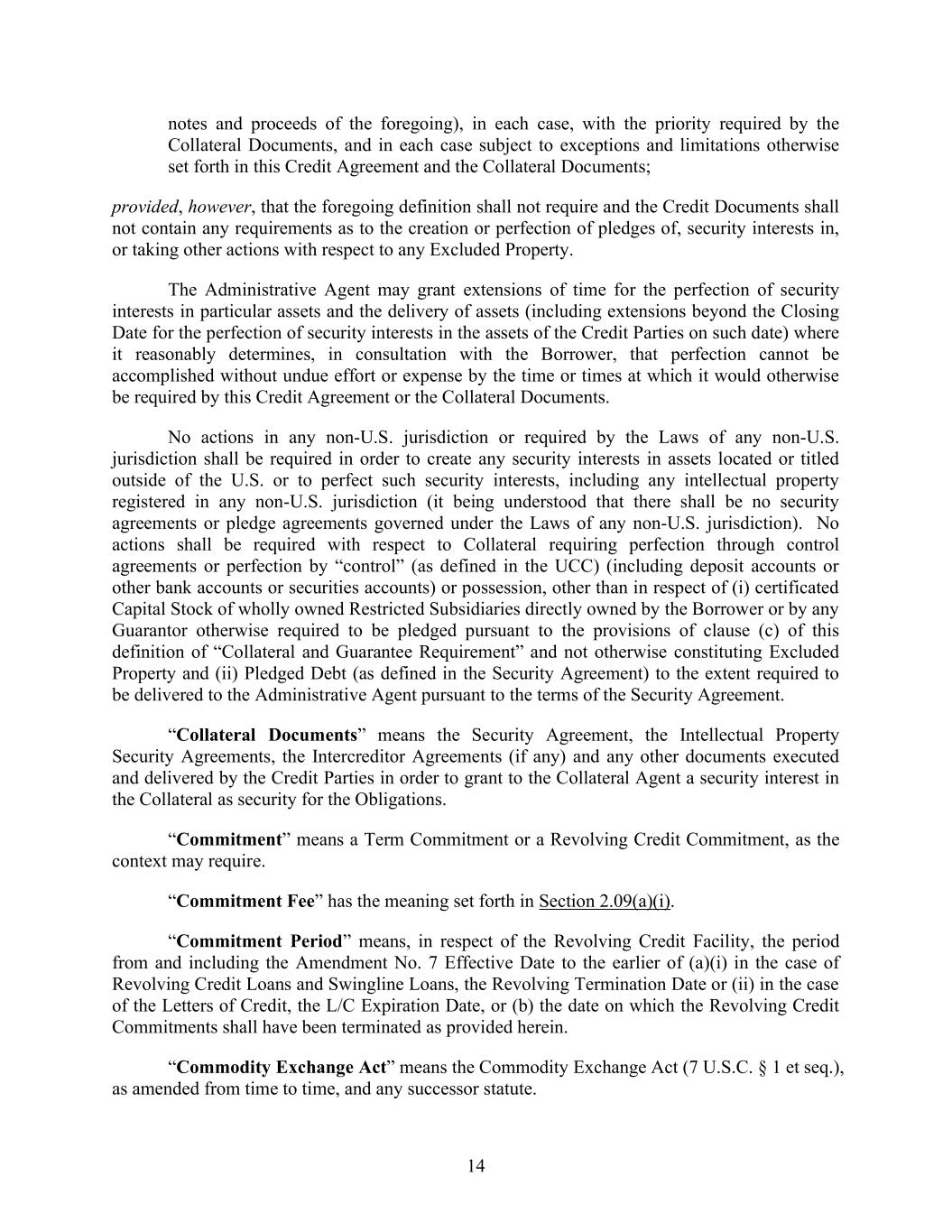 14 notes and proceeds of the foregoing), in each case, with the priority required by the Collateral Documents, and in each case subject to exceptions and limitations otherwise set forth in this Credit Agreement and the Collateral Documents; provided, however, that the foregoing definition shall not require and the Credit Documents shall not contain any requirements as to the creation or perfection of pledges of, security interests in, or taking other actions with respect to any Excluded Property. The Administrative Agent may grant extensions of time for the perfection of security interests in particular assets and the delivery of assets (including extensions beyond the Closing Date for the perfection of security interests in the assets of the Credit Parties on such date) where it reasonably determines, in consultation with the Borrower, that perfection cannot be accomplished without undue effort or expense by the time or times at which it would otherwise be required by this Credit Agreement or the Collateral Documents. No actions in any non-U.S. jurisdiction or required by the Laws of any non-U.S. jurisdiction shall be required in order to create any security interests in assets located or titled outside of the U.S. or to perfect such security interests, including any intellectual property registered in any non-U.S. jurisdiction (it being understood that there shall be no security agreements or pledge agreements governed under the Laws of any non-U.S. jurisdiction). No actions shall be required with respect to Collateral requiring perfection through control agreements or perfection by “control” (as defined in the UCC) (including deposit accounts or other bank accounts or securities accounts) or possession, other than in respect of (i) certificated Capital Stock of wholly owned Restricted Subsidiaries directly owned by the Borrower or by any Guarantor otherwise required to be pledged pursuant to the provisions of clause (c) of this definition of “Collateral and Guarantee Requirement” and not otherwise constituting Excluded Property and (ii) Pledged Debt (as defined in the Security Agreement) to the extent required to be delivered to the Administrative Agent pursuant to the terms of the Security Agreement. “Collateral Documents” means the Security Agreement, the Intellectual Property Security Agreements, the Intercreditor Agreements (if any) and any other documents executed and delivered by the Credit Parties in order to grant to the Collateral Agent a security interest in the Collateral as security for the Obligations. “Commitment” means a Term Commitment or a Revolving Credit Commitment, as the context may require. “Commitment Fee” has the meaning set forth in Section 2.09(a)(i). “Commitment Period” means, in respect of the Revolving Credit Facility, the period from and including the Amendment No. 7 Effective Date to the earlier of (a)(i) in the case of Revolving Credit Loans and Swingline Loans, the Revolving Termination Date or (ii) in the case of the Letters of Credit, the L/C Expiration Date, or (b) the date on which the Revolving Credit Commitments shall have been terminated as provided herein. “Commodity Exchange Act” means the Commodity Exchange Act (7 U.S.C. § 1 et seq.), as amended from time to time, and any successor statute.