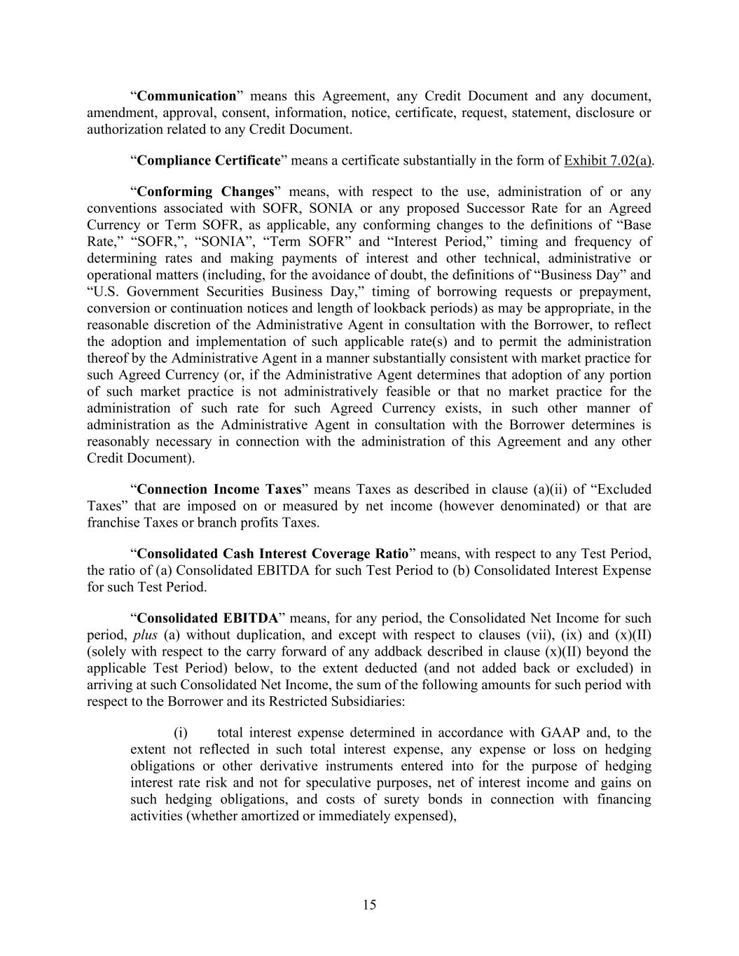 15 “Communication” means this Agreement, any Credit Document and any document, amendment, approval, consent, information, notice, certificate, request, statement, disclosure or authorization related to any Credit Document. “Compliance Certificate” means a certificate substantially in the form of Exhibit 7.02(a). “Conforming Changes” means, with respect to the use, administration of or any conventions associated with SOFR, SONIA or any proposed Successor Rate for an Agreed Currency or Term SOFR, as applicable, any conforming changes to the definitions of “Base Rate,” “SOFR,”, “SONIA”, “Term SOFR” and “Interest Period,” timing and frequency of determining rates and making payments of interest and other technical, administrative or operational matters (including, for the avoidance of doubt, the definitions of “Business Day” and “U.S. Government Securities Business Day,” timing of borrowing requests or prepayment, conversion or continuation notices and length of lookback periods) as may be appropriate, in the reasonable discretion of the Administrative Agent in consultation with the Borrower, to reflect the adoption and implementation of such applicable rate(s) and to permit the administration thereof by the Administrative Agent in a manner substantially consistent with market practice for such Agreed Currency (or, if the Administrative Agent determines that adoption of any portion of such market practice is not administratively feasible or that no market practice for the administration of such rate for such Agreed Currency exists, in such other manner of administration as the Administrative Agent in consultation with the Borrower determines is reasonably necessary in connection with the administration of this Agreement and any other Credit Document). “Connection Income Taxes” means Taxes as described in clause (a)(ii) of “Excluded Taxes” that are imposed on or measured by net income (however denominated) or that are franchise Taxes or branch profits Taxes. “Consolidated Cash Interest Coverage Ratio” means, with respect to any Test Period, the ratio of (a) Consolidated EBITDA for such Test Period to (b) Consolidated Interest Expense for such Test Period. “Consolidated EBITDA” means, for any period, the Consolidated Net Income for such period, plus (a) without duplication, and except with respect to clauses (vii), (ix) and (x)(II) (solely with respect to the carry forward of any addback described in clause (x)(II) beyond the applicable Test Period) below, to the extent deducted (and not added back or excluded) in arriving at such Consolidated Net Income, the sum of the following amounts for such period with respect to the Borrower and its Restricted Subsidiaries: (i) total interest expense determined in accordance with GAAP and, to the extent not reflected in such total interest expense, any expense or loss on hedging obligations or other derivative instruments entered into for the purpose of hedging interest rate risk and not for speculative purposes, net of interest income and gains on such hedging obligations, and costs of surety bonds in connection with financing activities (whether amortized or immediately expensed),