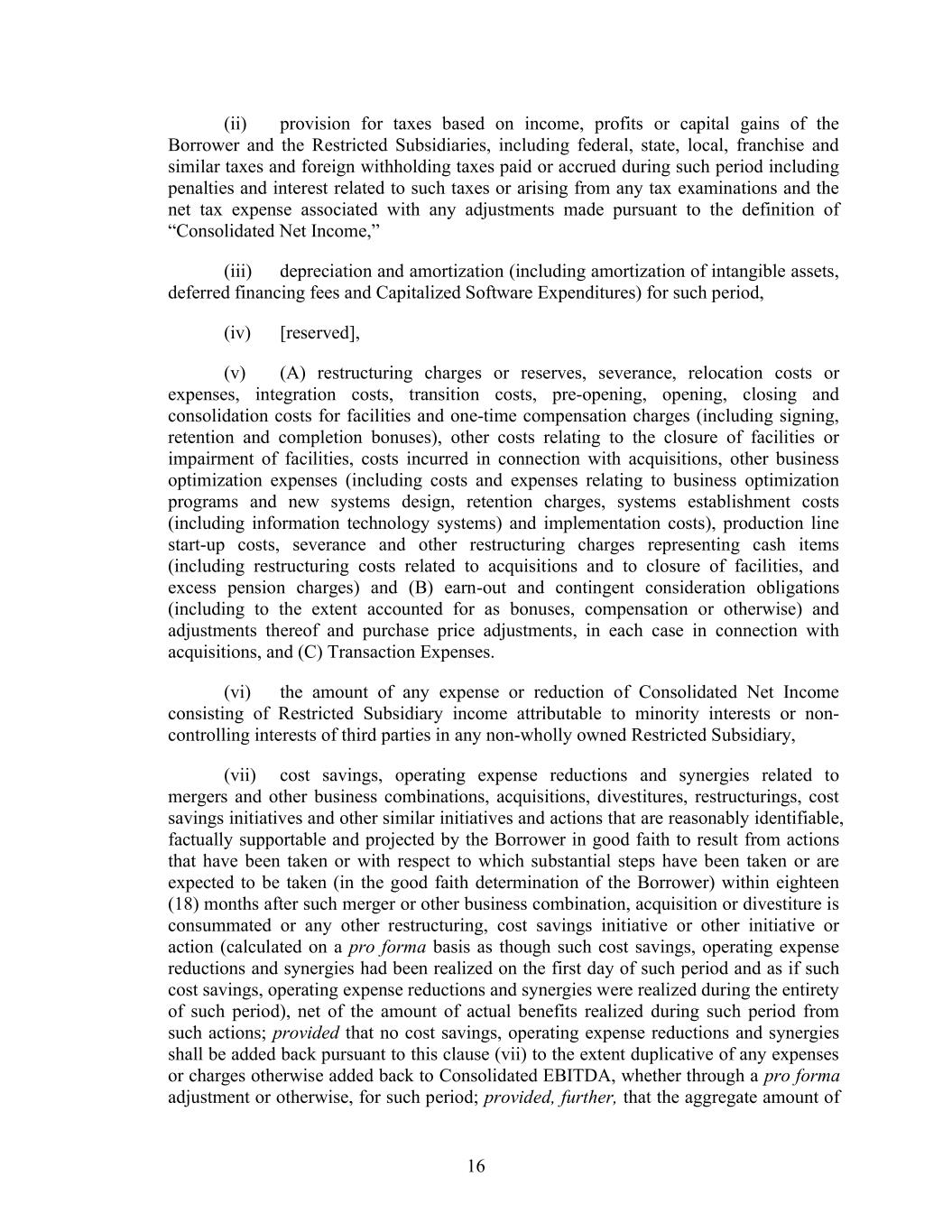 16 (ii) provision for taxes based on income, profits or capital gains of the Borrower and the Restricted Subsidiaries, including federal, state, local, franchise and similar taxes and foreign withholding taxes paid or accrued during such period including penalties and interest related to such taxes or arising from any tax examinations and the net tax expense associated with any adjustments made pursuant to the definition of “Consolidated Net Income,” (iii) depreciation and amortization (including amortization of intangible assets, deferred financing fees and Capitalized Software Expenditures) for such period, (iv) [reserved], (v) (A) restructuring charges or reserves, severance, relocation costs or expenses, integration costs, transition costs, pre-opening, opening, closing and consolidation costs for facilities and one-time compensation charges (including signing, retention and completion bonuses), other costs relating to the closure of facilities or impairment of facilities, costs incurred in connection with acquisitions, other business optimization expenses (including costs and expenses relating to business optimization programs and new systems design, retention charges, systems establishment costs (including information technology systems) and implementation costs), production line start-up costs, severance and other restructuring charges representing cash items (including restructuring costs related to acquisitions and to closure of facilities, and excess pension charges) and (B) earn-out and contingent consideration obligations (including to the extent accounted for as bonuses, compensation or otherwise) and adjustments thereof and purchase price adjustments, in each case in connection with acquisitions, and (C) Transaction Expenses. (vi) the amount of any expense or reduction of Consolidated Net Income consisting of Restricted Subsidiary income attributable to minority interests or non- controlling interests of third parties in any non-wholly owned Restricted Subsidiary, (vii) cost savings, operating expense reductions and synergies related to mergers and other business combinations, acquisitions, divestitures, restructurings, cost savings initiatives and other similar initiatives and actions that are reasonably identifiable, factually supportable and projected by the Borrower in good faith to result from actions that have been taken or with respect to which substantial steps have been taken or are expected to be taken (in the good faith determination of the Borrower) within eighteen (18) months after such merger or other business combination, acquisition or divestiture is consummated or any other restructuring, cost savings initiative or other initiative or action (calculated on a pro forma basis as though such cost savings, operating expense reductions and synergies had been realized on the first day of such period and as if such cost savings, operating expense reductions and synergies were realized during the entirety of such period), net of the amount of actual benefits realized during such period from such actions; provided that no cost savings, operating expense reductions and synergies shall be added back pursuant to this clause (vii) to the extent duplicative of any expenses or charges otherwise added back to Consolidated EBITDA, whether through a pro forma adjustment or otherwise, for such period; provided, further, that the aggregate amount of