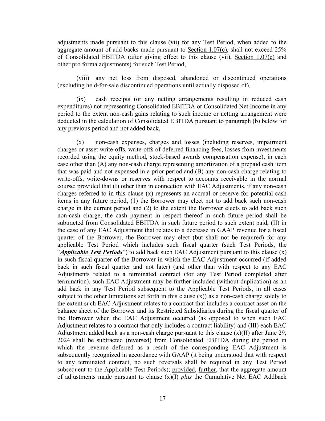 17 adjustments made pursuant to this clause (vii) for any Test Period, when added to the aggregate amount of add backs made pursuant to Section 1.07(c), shall not exceed 25% of Consolidated EBITDA (after giving effect to this clause (vii), Section 1.07(c) and other pro forma adjustments) for such Test Period, (viii) any net loss from disposed, abandoned or discontinued operations (excluding held-for-sale discontinued operations until actually disposed of), (ix) cash receipts (or any netting arrangements resulting in reduced cash expenditures) not representing Consolidated EBITDA or Consolidated Net Income in any period to the extent non-cash gains relating to such income or netting arrangement were deducted in the calculation of Consolidated EBITDA pursuant to paragraph (b) below for any previous period and not added back, (x) non-cash expenses, charges and losses (including reserves, impairment charges or asset write-offs, write-offs of deferred financing fees, losses from investments recorded using the equity method, stock-based awards compensation expense), in each case other than (A) any non-cash charge representing amortization of a prepaid cash item that was paid and not expensed in a prior period and (B) any non-cash charge relating to write-offs, write-downs or reserves with respect to accounts receivable in the normal course; provided that (I) other than in connection with EAC Adjustments, if any non-cash charges referred to in this clause (x) represents an accrual or reserve for potential cash items in any future period, (1) the Borrower may elect not to add back such non-cash charge in the current period and (2) to the extent the Borrower elects to add back such non-cash charge, the cash payment in respect thereof in such future period shall be subtracted from Consolidated EBITDA in such future period to such extent paid, (II) in the case of any EAC Adjustment that relates to a decrease in GAAP revenue for a fiscal quarter of the Borrower, the Borrower may elect (but shall not be required) for any applicable Test Period which includes such fiscal quarter (such Test Periods, the “Applicable Test Periods”) to add back such EAC Adjustment pursuant to this clause (x) in such fiscal quarter of the Borrower in which the EAC Adjustment occurred (if added back in such fiscal quarter and not later) (and other than with respect to any EAC Adjustments related to a terminated contract (for any Test Period completed after termination), such EAC Adjustment may be further included (without duplication) as an add back in any Test Period subsequent to the Applicable Test Periods, in all cases subject to the other limitations set forth in this clause (x)) as a non-cash charge solely to the extent such EAC Adjustment relates to a contract that includes a contract asset on the balance sheet of the Borrower and its Restricted Subsidiaries during the fiscal quarter of the Borrower when the EAC Adjustment occurred (as opposed to when such EAC Adjustment relates to a contract that only includes a contract liability) and (III) each EAC Adjustment added back as a non-cash charge pursuant to this clause (x)(II) after June 29, 2024 shall be subtracted (reversed) from Consolidated EBITDA during the period in which the revenue deferred as a result of the corresponding EAC Adjustment is subsequently recognized in accordance with GAAP (it being understood that with respect to any terminated contract, no such reversals shall be required in any Test Period subsequent to the Applicable Test Periods); provided, further, that the aggregate amount of adjustments made pursuant to clause (x)(I) plus the Cumulative Net EAC Addback