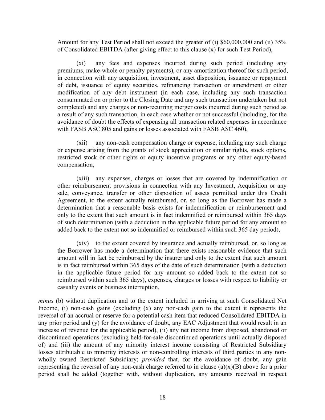 18 Amount for any Test Period shall not exceed the greater of (i) $60,000,000 and (ii) 35% of Consolidated EBITDA (after giving effect to this clause (x) for such Test Period), (xi) any fees and expenses incurred during such period (including any premiums, make-whole or penalty payments), or any amortization thereof for such period, in connection with any acquisition, investment, asset disposition, issuance or repayment of debt, issuance of equity securities, refinancing transaction or amendment or other modification of any debt instrument (in each case, including any such transaction consummated on or prior to the Closing Date and any such transaction undertaken but not completed) and any charges or non-recurring merger costs incurred during such period as a result of any such transaction, in each case whether or not successful (including, for the avoidance of doubt the effects of expensing all transaction related expenses in accordance with FASB ASC 805 and gains or losses associated with FASB ASC 460), (xii) any non-cash compensation charge or expense, including any such charge or expense arising from the grants of stock appreciation or similar rights, stock options, restricted stock or other rights or equity incentive programs or any other equity-based compensation, (xiii) any expenses, charges or losses that are covered by indemnification or other reimbursement provisions in connection with any Investment, Acquisition or any sale, conveyance, transfer or other disposition of assets permitted under this Credit Agreement, to the extent actually reimbursed, or, so long as the Borrower has made a determination that a reasonable basis exists for indemnification or reimbursement and only to the extent that such amount is in fact indemnified or reimbursed within 365 days of such determination (with a deduction in the applicable future period for any amount so added back to the extent not so indemnified or reimbursed within such 365 day period), (xiv) to the extent covered by insurance and actually reimbursed, or, so long as the Borrower has made a determination that there exists reasonable evidence that such amount will in fact be reimbursed by the insurer and only to the extent that such amount is in fact reimbursed within 365 days of the date of such determination (with a deduction in the applicable future period for any amount so added back to the extent not so reimbursed within such 365 days), expenses, charges or losses with respect to liability or casualty events or business interruption, minus (b) without duplication and to the extent included in arriving at such Consolidated Net Income, (i) non-cash gains (excluding (x) any non-cash gain to the extent it represents the reversal of an accrual or reserve for a potential cash item that reduced Consolidated EBITDA in any prior period and (y) for the avoidance of doubt, any EAC Adjustment that would result in an increase of revenue for the applicable period), (ii) any net income from disposed, abandoned or discontinued operations (excluding held-for-sale discontinued operations until actually disposed of) and (iii) the amount of any minority interest income consisting of Restricted Subsidiary losses attributable to minority interests or non-controlling interests of third parties in any non- wholly owned Restricted Subsidiary; provided that, for the avoidance of doubt, any gain representing the reversal of any non-cash charge referred to in clause (a)(x)(B) above for a prior period shall be added (together with, without duplication, any amounts received in respect