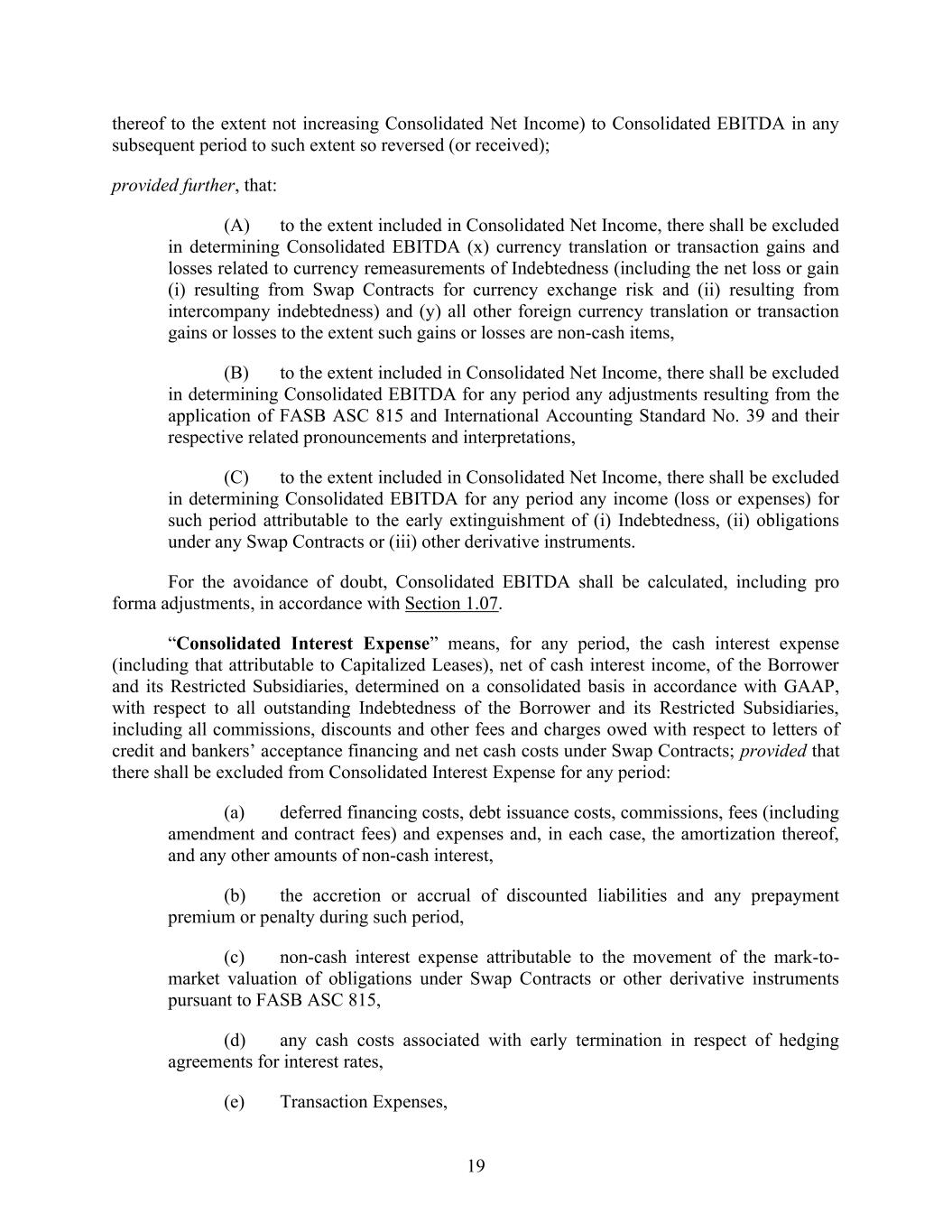 19 thereof to the extent not increasing Consolidated Net Income) to Consolidated EBITDA in any subsequent period to such extent so reversed (or received); provided further, that: (A) to the extent included in Consolidated Net Income, there shall be excluded in determining Consolidated EBITDA (x) currency translation or transaction gains and losses related to currency remeasurements of Indebtedness (including the net loss or gain (i) resulting from Swap Contracts for currency exchange risk and (ii) resulting from intercompany indebtedness) and (y) all other foreign currency translation or transaction gains or losses to the extent such gains or losses are non-cash items, (B) to the extent included in Consolidated Net Income, there shall be excluded in determining Consolidated EBITDA for any period any adjustments resulting from the application of FASB ASC 815 and International Accounting Standard No. 39 and their respective related pronouncements and interpretations, (C) to the extent included in Consolidated Net Income, there shall be excluded in determining Consolidated EBITDA for any period any income (loss or expenses) for such period attributable to the early extinguishment of (i) Indebtedness, (ii) obligations under any Swap Contracts or (iii) other derivative instruments. For the avoidance of doubt, Consolidated EBITDA shall be calculated, including pro forma adjustments, in accordance with Section 1.07. “Consolidated Interest Expense” means, for any period, the cash interest expense (including that attributable to Capitalized Leases), net of cash interest income, of the Borrower and its Restricted Subsidiaries, determined on a consolidated basis in accordance with GAAP, with respect to all outstanding Indebtedness of the Borrower and its Restricted Subsidiaries, including all commissions, discounts and other fees and charges owed with respect to letters of credit and bankers’ acceptance financing and net cash costs under Swap Contracts; provided that there shall be excluded from Consolidated Interest Expense for any period: (a) deferred financing costs, debt issuance costs, commissions, fees (including amendment and contract fees) and expenses and, in each case, the amortization thereof, and any other amounts of non-cash interest, (b) the accretion or accrual of discounted liabilities and any prepayment premium or penalty during such period, (c) non-cash interest expense attributable to the movement of the mark-to- market valuation of obligations under Swap Contracts or other derivative instruments pursuant to FASB ASC 815, (d) any cash costs associated with early termination in respect of hedging agreements for interest rates, (e) Transaction Expenses,