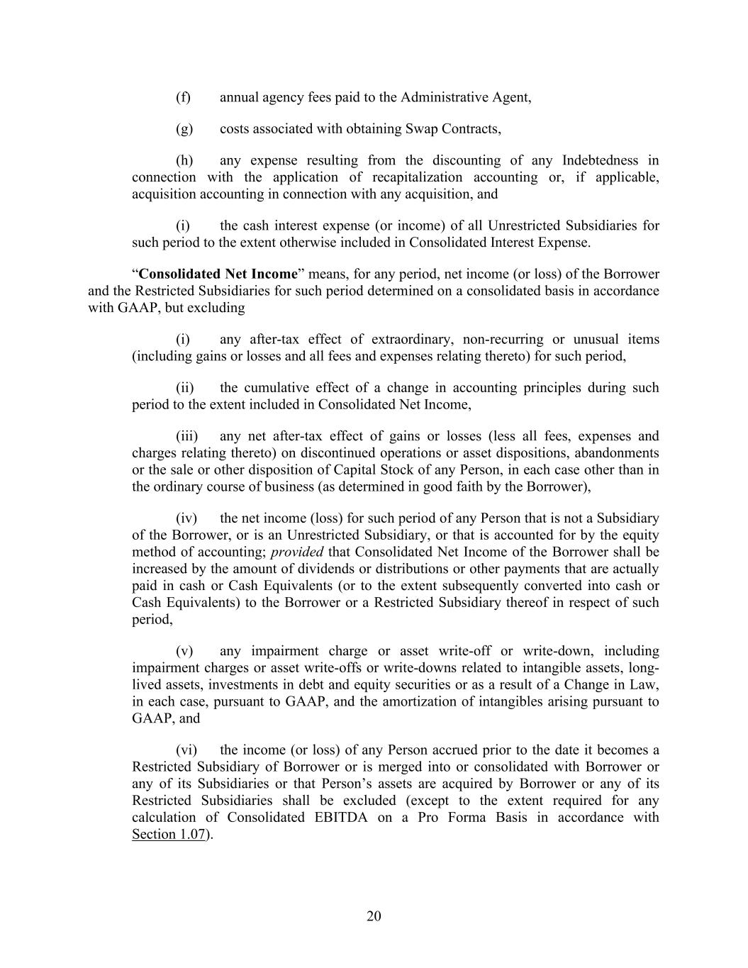 20 (f) annual agency fees paid to the Administrative Agent, (g) costs associated with obtaining Swap Contracts, (h) any expense resulting from the discounting of any Indebtedness in connection with the application of recapitalization accounting or, if applicable, acquisition accounting in connection with any acquisition, and (i) the cash interest expense (or income) of all Unrestricted Subsidiaries for such period to the extent otherwise included in Consolidated Interest Expense. “Consolidated Net Income” means, for any period, net income (or loss) of the Borrower and the Restricted Subsidiaries for such period determined on a consolidated basis in accordance with GAAP, but excluding (i) any after-tax effect of extraordinary, non-recurring or unusual items (including gains or losses and all fees and expenses relating thereto) for such period, (ii) the cumulative effect of a change in accounting principles during such period to the extent included in Consolidated Net Income, (iii) any net after-tax effect of gains or losses (less all fees, expenses and charges relating thereto) on discontinued operations or asset dispositions, abandonments or the sale or other disposition of Capital Stock of any Person, in each case other than in the ordinary course of business (as determined in good faith by the Borrower), (iv) the net income (loss) for such period of any Person that is not a Subsidiary of the Borrower, or is an Unrestricted Subsidiary, or that is accounted for by the equity method of accounting; provided that Consolidated Net Income of the Borrower shall be increased by the amount of dividends or distributions or other payments that are actually paid in cash or Cash Equivalents (or to the extent subsequently converted into cash or Cash Equivalents) to the Borrower or a Restricted Subsidiary thereof in respect of such period, (v) any impairment charge or asset write-off or write-down, including impairment charges or asset write-offs or write-downs related to intangible assets, long- lived assets, investments in debt and equity securities or as a result of a Change in Law, in each case, pursuant to GAAP, and the amortization of intangibles arising pursuant to GAAP, and (vi) the income (or loss) of any Person accrued prior to the date it becomes a Restricted Subsidiary of Borrower or is merged into or consolidated with Borrower or any of its Subsidiaries or that Person’s assets are acquired by Borrower or any of its Restricted Subsidiaries shall be excluded (except to the extent required for any calculation of Consolidated EBITDA on a Pro Forma Basis in accordance with Section 1.07).