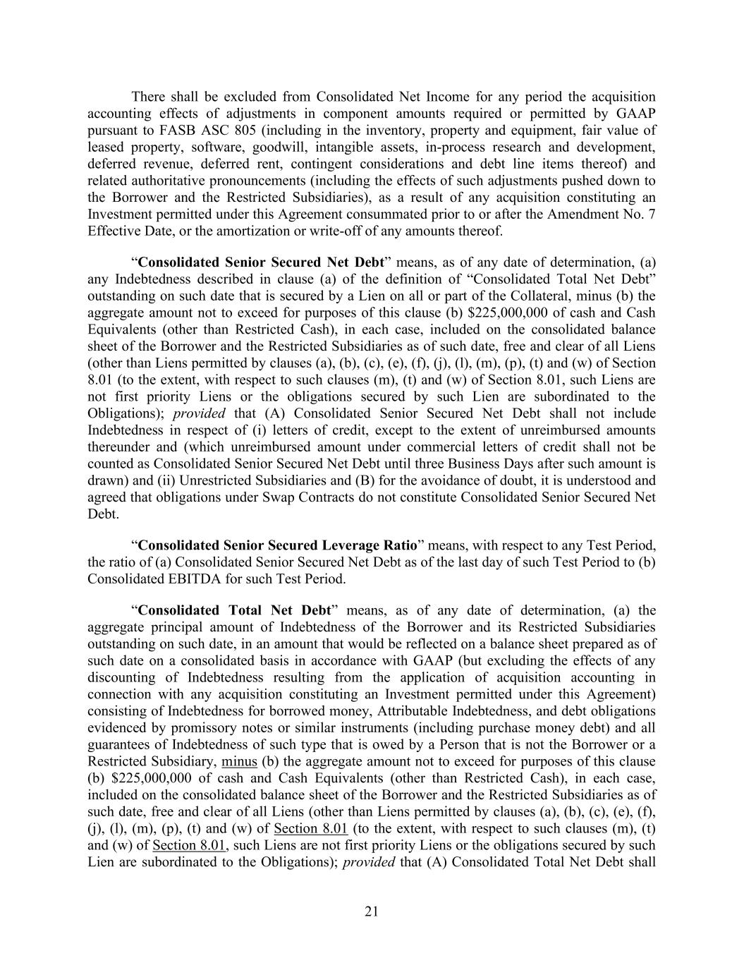 21 There shall be excluded from Consolidated Net Income for any period the acquisition accounting effects of adjustments in component amounts required or permitted by GAAP pursuant to FASB ASC 805 (including in the inventory, property and equipment, fair value of leased property, software, goodwill, intangible assets, in-process research and development, deferred revenue, deferred rent, contingent considerations and debt line items thereof) and related authoritative pronouncements (including the effects of such adjustments pushed down to the Borrower and the Restricted Subsidiaries), as a result of any acquisition constituting an Investment permitted under this Agreement consummated prior to or after the Amendment No. 7 Effective Date, or the amortization or write-off of any amounts thereof. “Consolidated Senior Secured Net Debt” means, as of any date of determination, (a) any Indebtedness described in clause (a) of the definition of “Consolidated Total Net Debt” outstanding on such date that is secured by a Lien on all or part of the Collateral, minus (b) the aggregate amount not to exceed for purposes of this clause (b) $225,000,000 of cash and Cash Equivalents (other than Restricted Cash), in each case, included on the consolidated balance sheet of the Borrower and the Restricted Subsidiaries as of such date, free and clear of all Liens (other than Liens permitted by clauses (a), (b), (c), (e), (f), (j), (l), (m), (p), (t) and (w) of Section 8.01 (to the extent, with respect to such clauses (m), (t) and (w) of Section 8.01, such Liens are not first priority Liens or the obligations secured by such Lien are subordinated to the Obligations); provided that (A) Consolidated Senior Secured Net Debt shall not include Indebtedness in respect of (i) letters of credit, except to the extent of unreimbursed amounts thereunder and (which unreimbursed amount under commercial letters of credit shall not be counted as Consolidated Senior Secured Net Debt until three Business Days after such amount is drawn) and (ii) Unrestricted Subsidiaries and (B) for the avoidance of doubt, it is understood and agreed that obligations under Swap Contracts do not constitute Consolidated Senior Secured Net Debt. “Consolidated Senior Secured Leverage Ratio” means, with respect to any Test Period, the ratio of (a) Consolidated Senior Secured Net Debt as of the last day of such Test Period to (b) Consolidated EBITDA for such Test Period. “Consolidated Total Net Debt” means, as of any date of determination, (a) the aggregate principal amount of Indebtedness of the Borrower and its Restricted Subsidiaries outstanding on such date, in an amount that would be reflected on a balance sheet prepared as of such date on a consolidated basis in accordance with GAAP (but excluding the effects of any discounting of Indebtedness resulting from the application of acquisition accounting in connection with any acquisition constituting an Investment permitted under this Agreement) consisting of Indebtedness for borrowed money, Attributable Indebtedness, and debt obligations evidenced by promissory notes or similar instruments (including purchase money debt) and all guarantees of Indebtedness of such type that is owed by a Person that is not the Borrower or a Restricted Subsidiary, minus (b) the aggregate amount not to exceed for purposes of this clause (b) $225,000,000 of cash and Cash Equivalents (other than Restricted Cash), in each case, included on the consolidated balance sheet of the Borrower and the Restricted Subsidiaries as of such date, free and clear of all Liens (other than Liens permitted by clauses (a), (b), (c), (e), (f), (j), (l), (m), (p), (t) and (w) of Section 8.01 (to the extent, with respect to such clauses (m), (t) and (w) of Section 8.01, such Liens are not first priority Liens or the obligations secured by such Lien are subordinated to the Obligations); provided that (A) Consolidated Total Net Debt shall