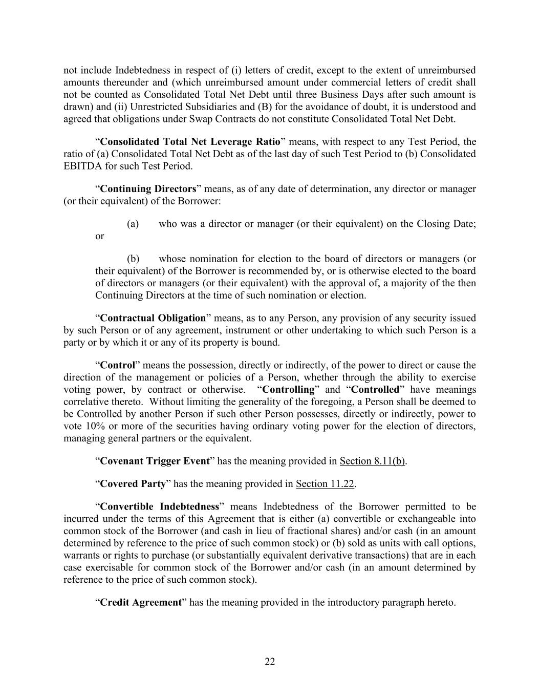 22 not include Indebtedness in respect of (i) letters of credit, except to the extent of unreimbursed amounts thereunder and (which unreimbursed amount under commercial letters of credit shall not be counted as Consolidated Total Net Debt until three Business Days after such amount is drawn) and (ii) Unrestricted Subsidiaries and (B) for the avoidance of doubt, it is understood and agreed that obligations under Swap Contracts do not constitute Consolidated Total Net Debt. “Consolidated Total Net Leverage Ratio” means, with respect to any Test Period, the ratio of (a) Consolidated Total Net Debt as of the last day of such Test Period to (b) Consolidated EBITDA for such Test Period. “Continuing Directors” means, as of any date of determination, any director or manager (or their equivalent) of the Borrower: (a) who was a director or manager (or their equivalent) on the Closing Date; or (b) whose nomination for election to the board of directors or managers (or their equivalent) of the Borrower is recommended by, or is otherwise elected to the board of directors or managers (or their equivalent) with the approval of, a majority of the then Continuing Directors at the time of such nomination or election. “Contractual Obligation” means, as to any Person, any provision of any security issued by such Person or of any agreement, instrument or other undertaking to which such Person is a party or by which it or any of its property is bound. “Control” means the possession, directly or indirectly, of the power to direct or cause the direction of the management or policies of a Person, whether through the ability to exercise voting power, by contract or otherwise. “Controlling” and “Controlled” have meanings correlative thereto. Without limiting the generality of the foregoing, a Person shall be deemed to be Controlled by another Person if such other Person possesses, directly or indirectly, power to vote 10% or more of the securities having ordinary voting power for the election of directors, managing general partners or the equivalent. “Covenant Trigger Event” has the meaning provided in Section 8.11(b). “Covered Party” has the meaning provided in Section 11.22. “Convertible Indebtedness” means Indebtedness of the Borrower permitted to be incurred under the terms of this Agreement that is either (a) convertible or exchangeable into common stock of the Borrower (and cash in lieu of fractional shares) and/or cash (in an amount determined by reference to the price of such common stock) or (b) sold as units with call options, warrants or rights to purchase (or substantially equivalent derivative transactions) that are in each case exercisable for common stock of the Borrower and/or cash (in an amount determined by reference to the price of such common stock). “Credit Agreement” has the meaning provided in the introductory paragraph hereto.