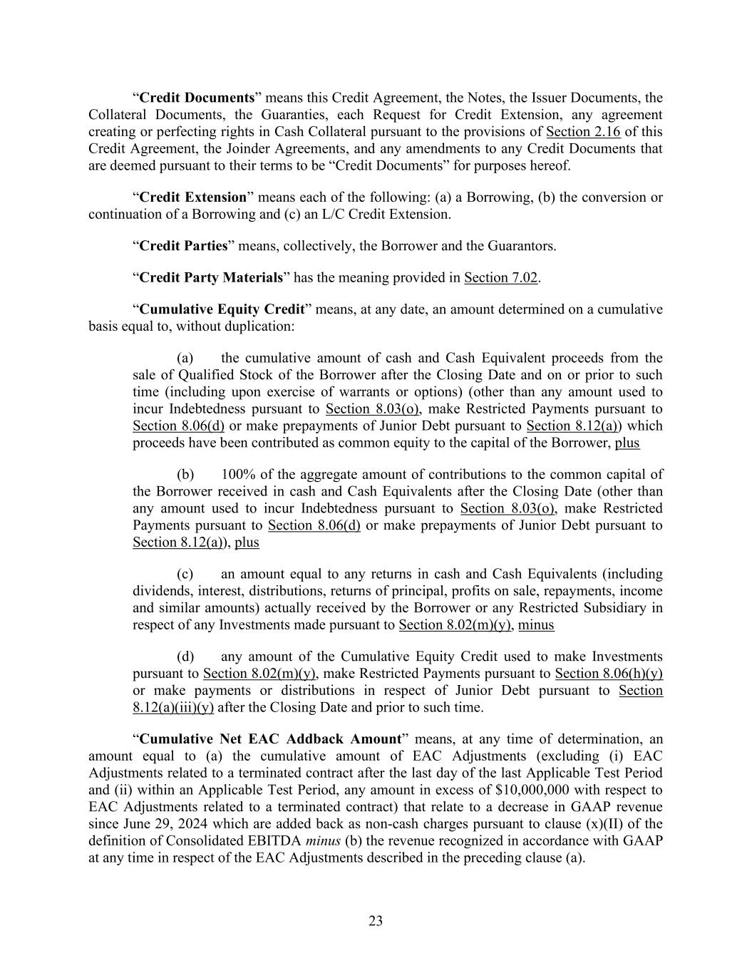23 “Credit Documents” means this Credit Agreement, the Notes, the Issuer Documents, the Collateral Documents, the Guaranties, each Request for Credit Extension, any agreement creating or perfecting rights in Cash Collateral pursuant to the provisions of Section 2.16 of this Credit Agreement, the Joinder Agreements, and any amendments to any Credit Documents that are deemed pursuant to their terms to be “Credit Documents” for purposes hereof. “Credit Extension” means each of the following: (a) a Borrowing, (b) the conversion or continuation of a Borrowing and (c) an L/C Credit Extension. “Credit Parties” means, collectively, the Borrower and the Guarantors. “Credit Party Materials” has the meaning provided in Section 7.02. “Cumulative Equity Credit” means, at any date, an amount determined on a cumulative basis equal to, without duplication: (a) the cumulative amount of cash and Cash Equivalent proceeds from the sale of Qualified Stock of the Borrower after the Closing Date and on or prior to such time (including upon exercise of warrants or options) (other than any amount used to incur Indebtedness pursuant to Section 8.03(o), make Restricted Payments pursuant to Section 8.06(d) or make prepayments of Junior Debt pursuant to Section 8.12(a)) which proceeds have been contributed as common equity to the capital of the Borrower, plus (b) 100% of the aggregate amount of contributions to the common capital of the Borrower received in cash and Cash Equivalents after the Closing Date (other than any amount used to incur Indebtedness pursuant to Section 8.03(o), make Restricted Payments pursuant to Section 8.06(d) or make prepayments of Junior Debt pursuant to Section 8.12(a)), plus (c) an amount equal to any returns in cash and Cash Equivalents (including dividends, interest, distributions, returns of principal, profits on sale, repayments, income and similar amounts) actually received by the Borrower or any Restricted Subsidiary in respect of any Investments made pursuant to Section 8.02(m)(y), minus (d) any amount of the Cumulative Equity Credit used to make Investments pursuant to Section 8.02(m)(y), make Restricted Payments pursuant to Section 8.06(h)(y) or make payments or distributions in respect of Junior Debt pursuant to Section 8.12(a)(iii)(y) after the Closing Date and prior to such time. “Cumulative Net EAC Addback Amount” means, at any time of determination, an amount equal to (a) the cumulative amount of EAC Adjustments (excluding (i) EAC Adjustments related to a terminated contract after the last day of the last Applicable Test Period and (ii) within an Applicable Test Period, any amount in excess of $10,000,000 with respect to EAC Adjustments related to a terminated contract) that relate to a decrease in GAAP revenue since June 29, 2024 which are added back as non-cash charges pursuant to clause (x)(II) of the definition of Consolidated EBITDA minus (b) the revenue recognized in accordance with GAAP at any time in respect of the EAC Adjustments described in the preceding clause (a).