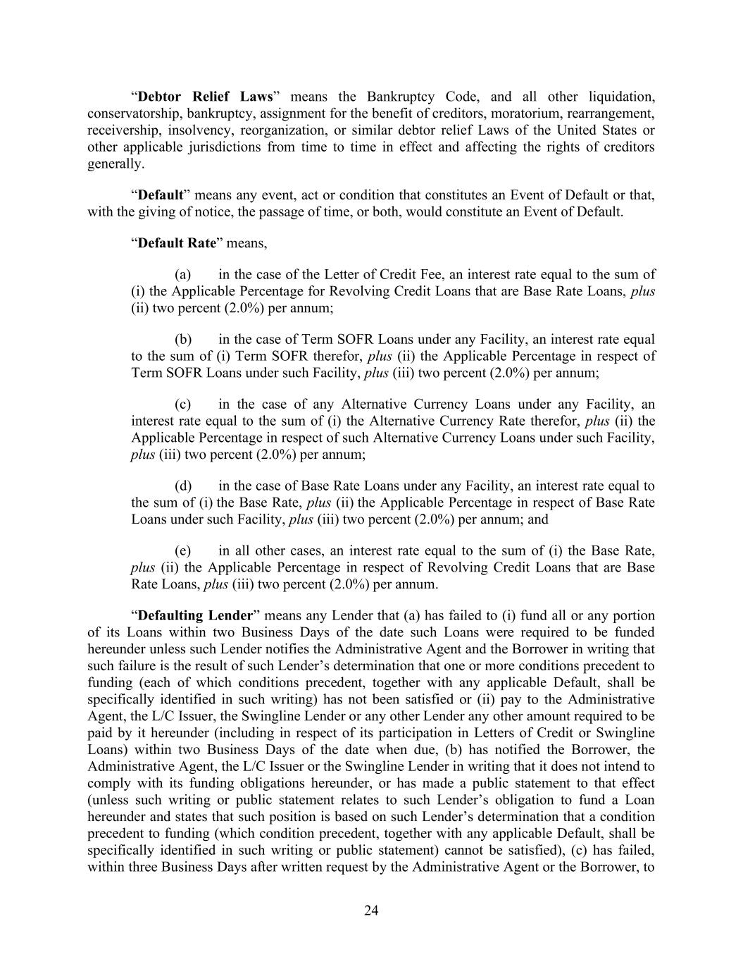 24 “Debtor Relief Laws” means the Bankruptcy Code, and all other liquidation, conservatorship, bankruptcy, assignment for the benefit of creditors, moratorium, rearrangement, receivership, insolvency, reorganization, or similar debtor relief Laws of the United States or other applicable jurisdictions from time to time in effect and affecting the rights of creditors generally. “Default” means any event, act or condition that constitutes an Event of Default or that, with the giving of notice, the passage of time, or both, would constitute an Event of Default. “Default Rate” means, (a) in the case of the Letter of Credit Fee, an interest rate equal to the sum of (i) the Applicable Percentage for Revolving Credit Loans that are Base Rate Loans, plus (ii) two percent (2.0%) per annum; (b) in the case of Term SOFR Loans under any Facility, an interest rate equal to the sum of (i) Term SOFR therefor, plus (ii) the Applicable Percentage in respect of Term SOFR Loans under such Facility, plus (iii) two percent (2.0%) per annum; (c) in the case of any Alternative Currency Loans under any Facility, an interest rate equal to the sum of (i) the Alternative Currency Rate therefor, plus (ii) the Applicable Percentage in respect of such Alternative Currency Loans under such Facility, plus (iii) two percent (2.0%) per annum; (d) in the case of Base Rate Loans under any Facility, an interest rate equal to the sum of (i) the Base Rate, plus (ii) the Applicable Percentage in respect of Base Rate Loans under such Facility, plus (iii) two percent (2.0%) per annum; and (e) in all other cases, an interest rate equal to the sum of (i) the Base Rate, plus (ii) the Applicable Percentage in respect of Revolving Credit Loans that are Base Rate Loans, plus (iii) two percent (2.0%) per annum. “Defaulting Lender” means any Lender that (a) has failed to (i) fund all or any portion of its Loans within two Business Days of the date such Loans were required to be funded hereunder unless such Lender notifies the Administrative Agent and the Borrower in writing that such failure is the result of such Lender’s determination that one or more conditions precedent to funding (each of which conditions precedent, together with any applicable Default, shall be specifically identified in such writing) has not been satisfied or (ii) pay to the Administrative Agent, the L/C Issuer, the Swingline Lender or any other Lender any other amount required to be paid by it hereunder (including in respect of its participation in Letters of Credit or Swingline Loans) within two Business Days of the date when due, (b) has notified the Borrower, the Administrative Agent, the L/C Issuer or the Swingline Lender in writing that it does not intend to comply with its funding obligations hereunder, or has made a public statement to that effect (unless such writing or public statement relates to such Lender’s obligation to fund a Loan hereunder and states that such position is based on such Lender’s determination that a condition precedent to funding (which condition precedent, together with any applicable Default, shall be specifically identified in such writing or public statement) cannot be satisfied), (c) has failed, within three Business Days after written request by the Administrative Agent or the Borrower, to
