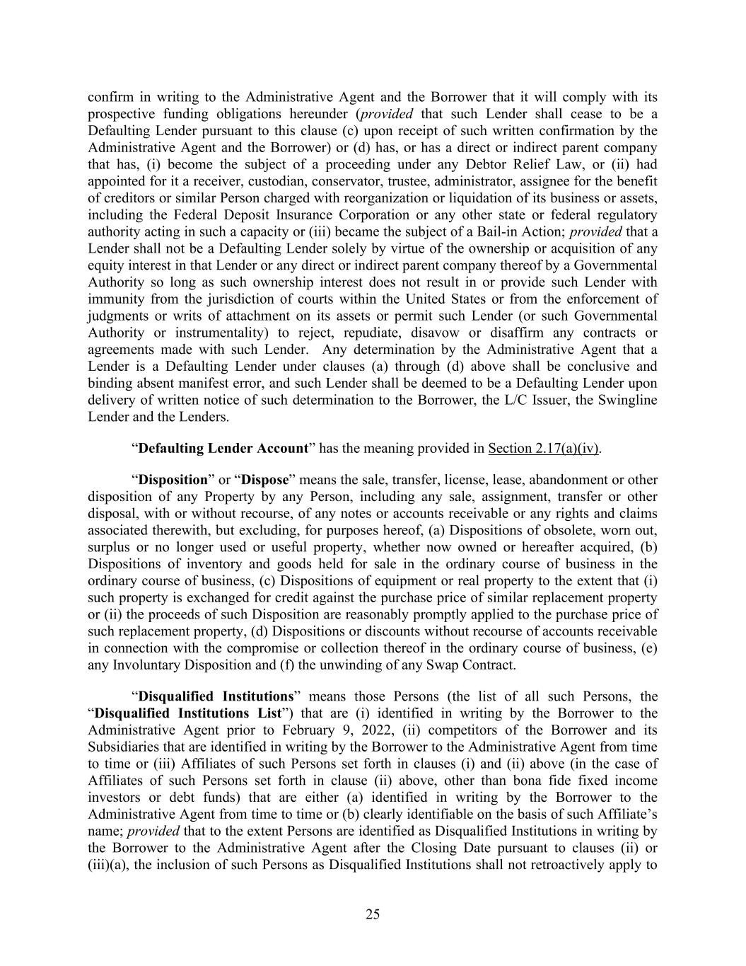 25 confirm in writing to the Administrative Agent and the Borrower that it will comply with its prospective funding obligations hereunder (provided that such Lender shall cease to be a Defaulting Lender pursuant to this clause (c) upon receipt of such written confirmation by the Administrative Agent and the Borrower) or (d) has, or has a direct or indirect parent company that has, (i) become the subject of a proceeding under any Debtor Relief Law, or (ii) had appointed for it a receiver, custodian, conservator, trustee, administrator, assignee for the benefit of creditors or similar Person charged with reorganization or liquidation of its business or assets, including the Federal Deposit Insurance Corporation or any other state or federal regulatory authority acting in such a capacity or (iii) became the subject of a Bail-in Action; provided that a Lender shall not be a Defaulting Lender solely by virtue of the ownership or acquisition of any equity interest in that Lender or any direct or indirect parent company thereof by a Governmental Authority so long as such ownership interest does not result in or provide such Lender with immunity from the jurisdiction of courts within the United States or from the enforcement of judgments or writs of attachment on its assets or permit such Lender (or such Governmental Authority or instrumentality) to reject, repudiate, disavow or disaffirm any contracts or agreements made with such Lender. Any determination by the Administrative Agent that a Lender is a Defaulting Lender under clauses (a) through (d) above shall be conclusive and binding absent manifest error, and such Lender shall be deemed to be a Defaulting Lender upon delivery of written notice of such determination to the Borrower, the L/C Issuer, the Swingline Lender and the Lenders. “Defaulting Lender Account” has the meaning provided in Section 2.17(a)(iv). “Disposition” or “Dispose” means the sale, transfer, license, lease, abandonment or other disposition of any Property by any Person, including any sale, assignment, transfer or other disposal, with or without recourse, of any notes or accounts receivable or any rights and claims associated therewith, but excluding, for purposes hereof, (a) Dispositions of obsolete, worn out, surplus or no longer used or useful property, whether now owned or hereafter acquired, (b) Dispositions of inventory and goods held for sale in the ordinary course of business in the ordinary course of business, (c) Dispositions of equipment or real property to the extent that (i) such property is exchanged for credit against the purchase price of similar replacement property or (ii) the proceeds of such Disposition are reasonably promptly applied to the purchase price of such replacement property, (d) Dispositions or discounts without recourse of accounts receivable in connection with the compromise or collection thereof in the ordinary course of business, (e) any Involuntary Disposition and (f) the unwinding of any Swap Contract. “Disqualified Institutions” means those Persons (the list of all such Persons, the “Disqualified Institutions List”) that are (i) identified in writing by the Borrower to the Administrative Agent prior to February 9, 2022, (ii) competitors of the Borrower and its Subsidiaries that are identified in writing by the Borrower to the Administrative Agent from time to time or (iii) Affiliates of such Persons set forth in clauses (i) and (ii) above (in the case of Affiliates of such Persons set forth in clause (ii) above, other than bona fide fixed income investors or debt funds) that are either (a) identified in writing by the Borrower to the Administrative Agent from time to time or (b) clearly identifiable on the basis of such Affiliate’s name; provided that to the extent Persons are identified as Disqualified Institutions in writing by the Borrower to the Administrative Agent after the Closing Date pursuant to clauses (ii) or (iii)(a), the inclusion of such Persons as Disqualified Institutions shall not retroactively apply to
