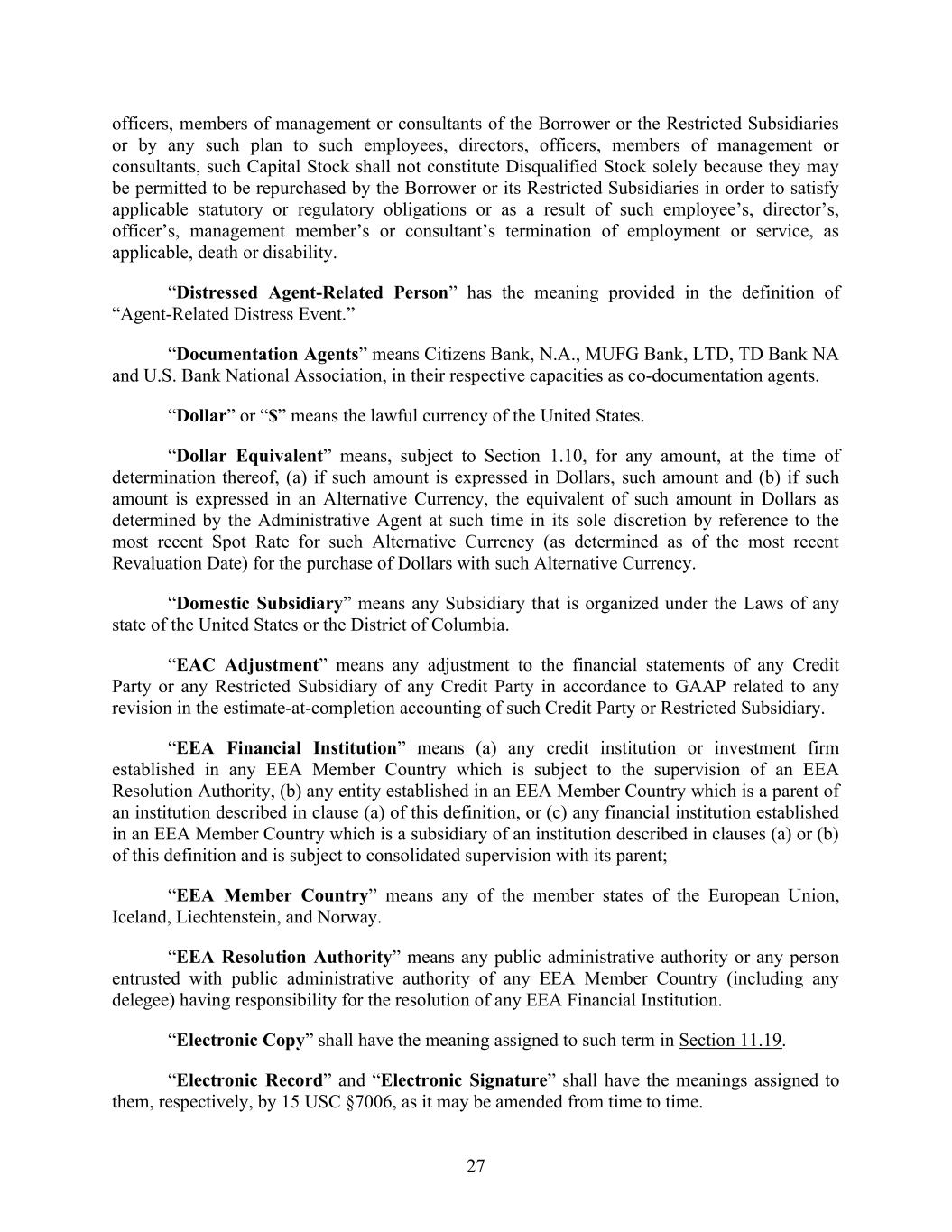 27 officers, members of management or consultants of the Borrower or the Restricted Subsidiaries or by any such plan to such employees, directors, officers, members of management or consultants, such Capital Stock shall not constitute Disqualified Stock solely because they may be permitted to be repurchased by the Borrower or its Restricted Subsidiaries in order to satisfy applicable statutory or regulatory obligations or as a result of such employee’s, director’s, officer’s, management member’s or consultant’s termination of employment or service, as applicable, death or disability. “Distressed Agent-Related Person” has the meaning provided in the definition of “Agent-Related Distress Event.” “Documentation Agents” means Citizens Bank, N.A., MUFG Bank, LTD, TD Bank NA and U.S. Bank National Association, in their respective capacities as co-documentation agents. “Dollar” or “$” means the lawful currency of the United States. “Dollar Equivalent” means, subject to Section 1.10, for any amount, at the time of determination thereof, (a) if such amount is expressed in Dollars, such amount and (b) if such amount is expressed in an Alternative Currency, the equivalent of such amount in Dollars as determined by the Administrative Agent at such time in its sole discretion by reference to the most recent Spot Rate for such Alternative Currency (as determined as of the most recent Revaluation Date) for the purchase of Dollars with such Alternative Currency. “Domestic Subsidiary” means any Subsidiary that is organized under the Laws of any state of the United States or the District of Columbia. “EAC Adjustment” means any adjustment to the financial statements of any Credit Party or any Restricted Subsidiary of any Credit Party in accordance to GAAP related to any revision in the estimate-at-completion accounting of such Credit Party or Restricted Subsidiary. “EEA Financial Institution” means (a) any credit institution or investment firm established in any EEA Member Country which is subject to the supervision of an EEA Resolution Authority, (b) any entity established in an EEA Member Country which is a parent of an institution described in clause (a) of this definition, or (c) any financial institution established in an EEA Member Country which is a subsidiary of an institution described in clauses (a) or (b) of this definition and is subject to consolidated supervision with its parent; “EEA Member Country” means any of the member states of the European Union, Iceland, Liechtenstein, and Norway. “EEA Resolution Authority” means any public administrative authority or any person entrusted with public administrative authority of any EEA Member Country (including any delegee) having responsibility for the resolution of any EEA Financial Institution. “Electronic Copy” shall have the meaning assigned to such term in Section 11.19. “Electronic Record” and “Electronic Signature” shall have the meanings assigned to them, respectively, by 15 USC §7006, as it may be amended from time to time.