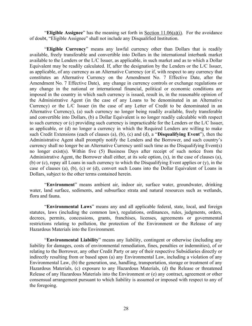 28 “Eligible Assignee” has the meaning set forth in Section 11.06(a)(i). For the avoidance of doubt, “Eligible Assignee” shall not include any Disqualified Institution. “Eligible Currency” means any lawful currency other than Dollars that is readily available, freely transferable and convertible into Dollars in the international interbank market available to the Lenders or the L/C Issuer, as applicable, in such market and as to which a Dollar Equivalent may be readily calculated. If, after the designation by the Lenders or the L/C Issuer, as applicable, of any currency as an Alternative Currency (or if, with respect to any currency that constitutes an Alternative Currency on the Amendment No. 7 Effective Date, after the Amendment No. 7 Effective Date), any change in currency controls or exchange regulations or any change in the national or international financial, political or economic conditions are imposed in the country in which such currency is issued, result in, in the reasonable opinion of the Administrative Agent (in the case of any Loans to be denominated in an Alternative Currency) or the L/C Issuer (in the case of any Letter of Credit to be denominated in an Alternative Currency), (a) such currency no longer being readily available, freely transferable and convertible into Dollars, (b) a Dollar Equivalent is no longer readily calculable with respect to such currency or (c) providing such currency is impracticable for the Lenders or the L/C Issuer, as applicable, or (d) no longer a currency in which the Required Lenders are willing to make such Credit Extensions (each of clauses (a), (b), (c) and (d), a “Disqualifying Event”), then the Administrative Agent shall promptly notify the Lenders and the Borrower, and such country’s currency shall no longer be an Alternative Currency until such time as the Disqualifying Event(s) no longer exist(s). Within five (5) Business Days after receipt of such notice from the Administrative Agent, the Borrower shall either, at its sole option, (x), in the case of clauses (a), (b) or (c), repay all Loans in such currency to which the Disqualifying Event applies or (y), in the case of clauses (a), (b), (c) or (d), convert such Loans into the Dollar Equivalent of Loans in Dollars, subject to the other terms contained herein. “Environment” means ambient air, indoor air, surface water, groundwater, drinking water, land surface, sediments, and subsurface strata and natural resources such as wetlands, flora and fauna. “Environmental Laws” means any and all applicable federal, state, local, and foreign statutes, laws (including the common law), regulations, ordinances, rules, judgments, orders, decrees, permits, concessions, grants, franchises, licenses, agreements or governmental restrictions relating to pollution, the protection of the Environment or the Release of any Hazardous Materials into the Environment. “Environmental Liability” means any liability, contingent or otherwise (including any liability for damages, costs of environmental remediation, fines, penalties or indemnities), of or relating to the Borrower, any other Credit Party or any of their respective Subsidiaries directly or indirectly resulting from or based upon (a) any Environmental Law, including a violation of any Environmental Law, (b) the generation, use, handling, transportation, storage or treatment of any Hazardous Materials, (c) exposure to any Hazardous Materials, (d) the Release or threatened Release of any Hazardous Materials into the Environment or (e) any contract, agreement or other consensual arrangement pursuant to which liability is assumed or imposed with respect to any of the foregoing.