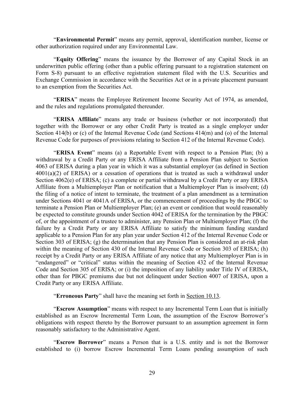 29 “Environmental Permit” means any permit, approval, identification number, license or other authorization required under any Environmental Law. “Equity Offering” means the issuance by the Borrower of any Capital Stock in an underwritten public offering (other than a public offering pursuant to a registration statement on Form S-8) pursuant to an effective registration statement filed with the U.S. Securities and Exchange Commission in accordance with the Securities Act or in a private placement pursuant to an exemption from the Securities Act. “ERISA” means the Employee Retirement Income Security Act of 1974, as amended, and the rules and regulations promulgated thereunder. “ERISA Affiliate” means any trade or business (whether or not incorporated) that together with the Borrower or any other Credit Party is treated as a single employer under Section 414(b) or (c) of the Internal Revenue Code (and Sections 414(m) and (o) of the Internal Revenue Code for purposes of provisions relating to Section 412 of the Internal Revenue Code). “ERISA Event” means (a) a Reportable Event with respect to a Pension Plan; (b) a withdrawal by a Credit Party or any ERISA Affiliate from a Pension Plan subject to Section 4063 of ERISA during a plan year in which it was a substantial employer (as defined in Section 4001(a)(2) of ERISA) or a cessation of operations that is treated as such a withdrawal under Section 4062(e) of ERISA; (c) a complete or partial withdrawal by a Credit Party or any ERISA Affiliate from a Multiemployer Plan or notification that a Multiemployer Plan is insolvent; (d) the filing of a notice of intent to terminate, the treatment of a plan amendment as a termination under Sections 4041 or 4041A of ERISA, or the commencement of proceedings by the PBGC to terminate a Pension Plan or Multiemployer Plan; (e) an event or condition that would reasonably be expected to constitute grounds under Section 4042 of ERISA for the termination by the PBGC of, or the appointment of a trustee to administer, any Pension Plan or Multiemployer Plan; (f) the failure by a Credit Party or any ERISA Affiliate to satisfy the minimum funding standard applicable to a Pension Plan for any plan year under Section 412 of the Internal Revenue Code or Section 303 of ERISA; (g) the determination that any Pension Plan is considered an at-risk plan within the meaning of Section 430 of the Internal Revenue Code or Section 303 of ERISA; (h) receipt by a Credit Party or any ERISA Affiliate of any notice that any Multiemployer Plan is in “endangered” or “critical” status within the meaning of Section 432 of the Internal Revenue Code and Section 305 of ERISA; or (i) the imposition of any liability under Title IV of ERISA, other than for PBGC premiums due but not delinquent under Section 4007 of ERISA, upon a Credit Party or any ERISA Affiliate. “Erroneous Party” shall have the meaning set forth in Section 10.13. “Escrow Assumption” means with respect to any Incremental Term Loan that is initially established as an Escrow Incremental Term Loan, the assumption of the Escrow Borrower’s obligations with respect thereto by the Borrower pursuant to an assumption agreement in form reasonably satisfactory to the Administrative Agent. “Escrow Borrower” means a Person that is a U.S. entity and is not the Borrower established to (i) borrow Escrow Incremental Term Loans pending assumption of such