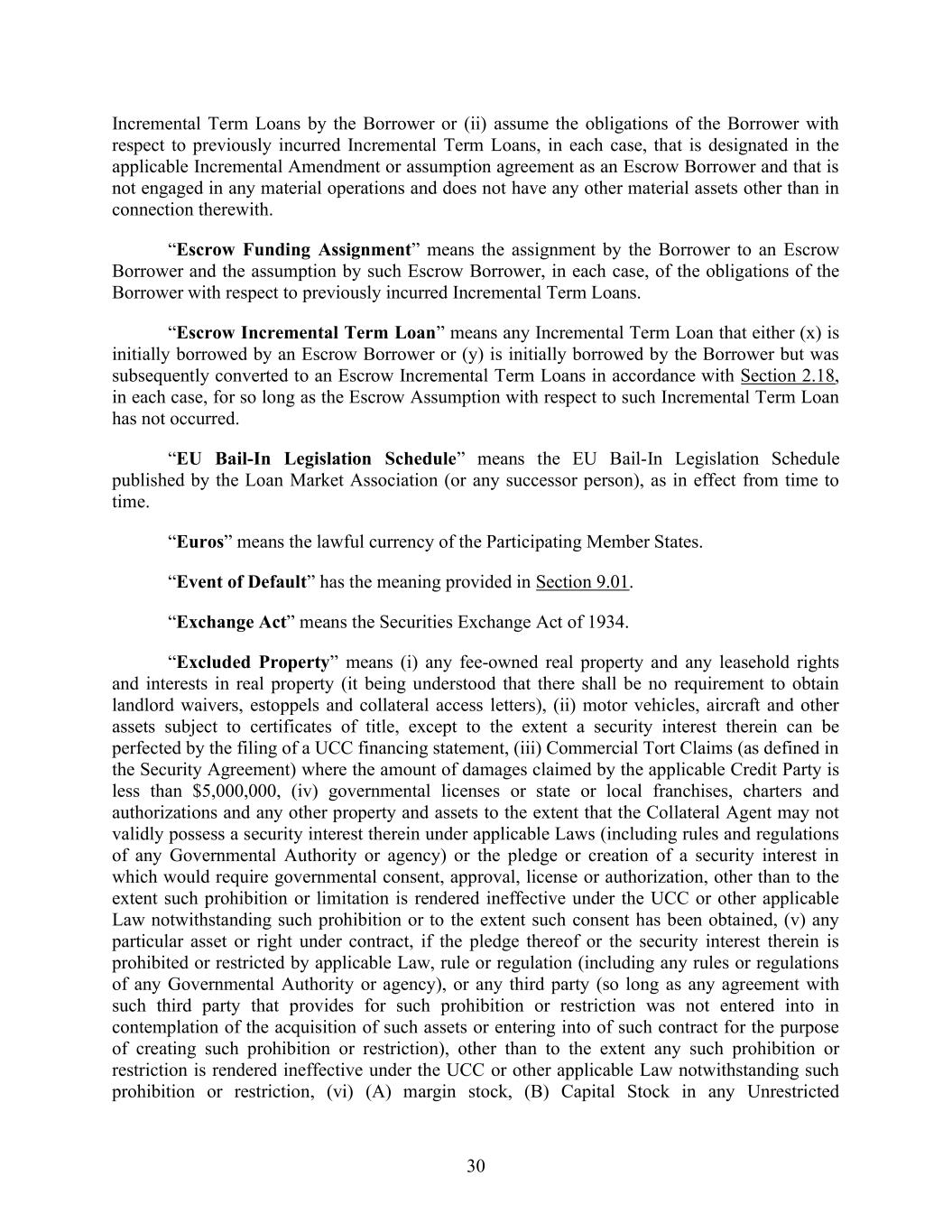 30 Incremental Term Loans by the Borrower or (ii) assume the obligations of the Borrower with respect to previously incurred Incremental Term Loans, in each case, that is designated in the applicable Incremental Amendment or assumption agreement as an Escrow Borrower and that is not engaged in any material operations and does not have any other material assets other than in connection therewith. “Escrow Funding Assignment” means the assignment by the Borrower to an Escrow Borrower and the assumption by such Escrow Borrower, in each case, of the obligations of the Borrower with respect to previously incurred Incremental Term Loans. “Escrow Incremental Term Loan” means any Incremental Term Loan that either (x) is initially borrowed by an Escrow Borrower or (y) is initially borrowed by the Borrower but was subsequently converted to an Escrow Incremental Term Loans in accordance with Section 2.18, in each case, for so long as the Escrow Assumption with respect to such Incremental Term Loan has not occurred. “EU Bail-In Legislation Schedule” means the EU Bail-In Legislation Schedule published by the Loan Market Association (or any successor person), as in effect from time to time. “Euros” means the lawful currency of the Participating Member States. “Event of Default” has the meaning provided in Section 9.01. “Exchange Act” means the Securities Exchange Act of 1934. “Excluded Property” means (i) any fee-owned real property and any leasehold rights and interests in real property (it being understood that there shall be no requirement to obtain landlord waivers, estoppels and collateral access letters), (ii) motor vehicles, aircraft and other assets subject to certificates of title, except to the extent a security interest therein can be perfected by the filing of a UCC financing statement, (iii) Commercial Tort Claims (as defined in the Security Agreement) where the amount of damages claimed by the applicable Credit Party is less than $5,000,000, (iv) governmental licenses or state or local franchises, charters and authorizations and any other property and assets to the extent that the Collateral Agent may not validly possess a security interest therein under applicable Laws (including rules and regulations of any Governmental Authority or agency) or the pledge or creation of a security interest in which would require governmental consent, approval, license or authorization, other than to the extent such prohibition or limitation is rendered ineffective under the UCC or other applicable Law notwithstanding such prohibition or to the extent such consent has been obtained, (v) any particular asset or right under contract, if the pledge thereof or the security interest therein is prohibited or restricted by applicable Law, rule or regulation (including any rules or regulations of any Governmental Authority or agency), or any third party (so long as any agreement with such third party that provides for such prohibition or restriction was not entered into in contemplation of the acquisition of such assets or entering into of such contract for the purpose of creating such prohibition or restriction), other than to the extent any such prohibition or restriction is rendered ineffective under the UCC or other applicable Law notwithstanding such prohibition or restriction, (vi) (A) margin stock, (B) Capital Stock in any Unrestricted