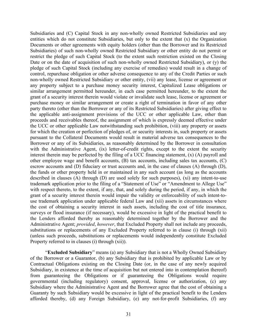 31 Subsidiaries and (C) Capital Stock in any non-wholly owned Restricted Subsidiaries and any entities which do not constitute Subsidiaries, but only to the extent that (x) the Organization Documents or other agreements with equity holders (other than the Borrower and its Restricted Subsidiaries) of such non-wholly owned Restricted Subsidiary or other entity do not permit or restrict the pledge of such Capital Stock (to the extent such restriction existed on the Closing Date or on the date of acquisition of such non-wholly owned Restricted Subsidiary), or (y) the pledge of such Capital Stock (including any exercise of remedies) would result in a change of control, repurchase obligation or other adverse consequence to any of the Credit Parties or such non-wholly owned Restricted Subsidiary or other entity, (vii) any lease, license or agreement or any property subject to a purchase money security interest, Capitalized Lease obligations or similar arrangement permitted hereunder, in each case permitted hereunder, to the extent the grant of a security interest therein would violate or invalidate such lease, license or agreement or purchase money or similar arrangement or create a right of termination in favor of any other party thereto (other than the Borrower or any of its Restricted Subsidiaries) after giving effect to the applicable anti-assignment provisions of the UCC or other applicable Law, other than proceeds and receivables thereof, the assignment of which is expressly deemed effective under the UCC or other applicable Law notwithstanding such prohibition, (viii) any property or assets for which the creation or perfection of pledges of, or security interests in, such property or assets pursuant to the Collateral Documents would result in material adverse tax consequences to the Borrower or any of its Subsidiaries, as reasonably determined by the Borrower in consultation with the Administrative Agent, (ix) letter-of-credit rights, except to the extent the security interest therein may be perfected by the filing of a UCC financing statement, (x) (A) payroll and other employee wage and benefit accounts, (B) tax accounts, including sales tax accounts, (C) escrow accounts and (D) fiduciary or trust accounts and, in the case of clauses (A) through (D), the funds or other property held in or maintained in any such account (as long as the accounts described in clauses (A) through (D) are used solely for such purposes), (xi) any intent-to-use trademark application prior to the filing of a “Statement of Use” or “Amendment to Allege Use” with respect thereto, to the extent, if any, that, and solely during the period, if any, in which the grant of a security interest therein would impair the validity or enforceability of such intent-to- use trademark application under applicable federal Law and (xii) assets in circumstances where the cost of obtaining a security interest in such assets, including the cost of title insurance, surveys or flood insurance (if necessary), would be excessive in light of the practical benefit to the Lenders afforded thereby as reasonably determined together by the Borrower and the Administrative Agent; provided, however, that Excluded Property shall not include any proceeds, substitutions or replacements of any Excluded Property referred to in clause (i) through (xii) (unless such proceeds, substitutions or replacements would independently constitute Excluded Property referred to in clauses (i) through (xii)). “Excluded Subsidiary” means (a) any Subsidiary that is not a Wholly Owned Subsidiary of the Borrower or a Guarantor, (b) any Subsidiary that is prohibited by applicable Law or by Contractual Obligations existing on the Closing Date (or, in the case of any newly acquired Subsidiary, in existence at the time of acquisition but not entered into in contemplation thereof) from guaranteeing the Obligations or if guaranteeing the Obligations would require governmental (including regulatory) consent, approval, license or authorization, (c) any Subsidiary where the Administrative Agent and the Borrower agree that the cost of obtaining a Guaranty by such Subsidiary would be excessive in light of the practical benefit to the Lenders afforded thereby, (d) any Foreign Subsidiary, (e) any not-for-profit Subsidiaries, (f) any
