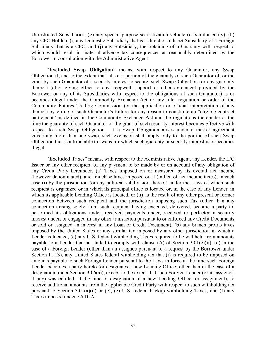 32 Unrestricted Subsidiaries, (g) any special purpose securitization vehicle (or similar entity), (h) any CFC Holdco, (i) any Domestic Subsidiary that is a direct or indirect Subsidiary of a Foreign Subsidiary that is a CFC, and (j) any Subsidiary, the obtaining of a Guaranty with respect to which would result in material adverse tax consequences as reasonably determined by the Borrower in consultation with the Administrative Agent. “Excluded Swap Obligation” means, with respect to any Guarantor, any Swap Obligation if, and to the extent that, all or a portion of the guaranty of such Guarantor of, or the grant by such Guarantor of a security interest to secure, such Swap Obligation (or any guaranty thereof) (after giving effect to any keepwell, support or other agreement provided by the Borrower or any of its Subsidiaries with respect to the obligations of such Guarantor) is or becomes illegal under the Commodity Exchange Act or any rule, regulation or order of the Commodity Futures Trading Commission (or the application or official interpretation of any thereof) by virtue of such Guarantor’s failure for any reason to constitute an “eligible contract participant” as defined in the Commodity Exchange Act and the regulations thereunder at the time the guaranty of such Guarantor or the grant of such security interest becomes effective with respect to such Swap Obligation. If a Swap Obligation arises under a master agreement governing more than one swap, such exclusion shall apply only to the portion of such Swap Obligation that is attributable to swaps for which such guaranty or security interest is or becomes illegal. “Excluded Taxes” means, with respect to the Administrative Agent, any Lender, the L/C Issuer or any other recipient of any payment to be made by or on account of any obligation of any Credit Party hereunder, (a) Taxes imposed on or measured by its overall net income (however denominated), and franchise taxes imposed on it (in lieu of net income taxes), in each case (i) by the jurisdiction (or any political subdivision thereof) under the Laws of which such recipient is organized or in which its principal office is located or, in the case of any Lender, in which its applicable Lending Office is located, or (ii) as the result of any other present or former connection between such recipient and the jurisdiction imposing such Tax (other than any connection arising solely from such recipient having executed, delivered, become a party to, performed its obligations under, received payments under, received or perfected a security interest under, or engaged in any other transaction pursuant to or enforced any Credit Documents, or sold or assigned an interest in any Loan or Credit Document), (b) any branch profits taxes imposed by the United States or any similar tax imposed by any other jurisdiction in which a Lender is located, (c) any U.S. federal withholding Taxes required to be withheld from amounts payable to a Lender that has failed to comply with clause (A) of Section 3.01(e)(ii), (d) in the case of a Foreign Lender (other than an assignee pursuant to a request by the Borrower under Section 11.13), any United States federal withholding tax that (i) is required to be imposed on amounts payable to such Foreign Lender pursuant to the Laws in force at the time such Foreign Lender becomes a party hereto (or designates a new Lending Office, other than in the case of a designation under Section 3.06(a)), except to the extent that such Foreign Lender (or its assignor, if any) was entitled, at the time of designation of a new Lending Office (or assignment), to receive additional amounts from the applicable Credit Party with respect to such withholding tax pursuant to Section 3.01(a)(ii) or (c), (e) U.S. federal backup withholding Taxes, and (f) any Taxes imposed under FATCA.