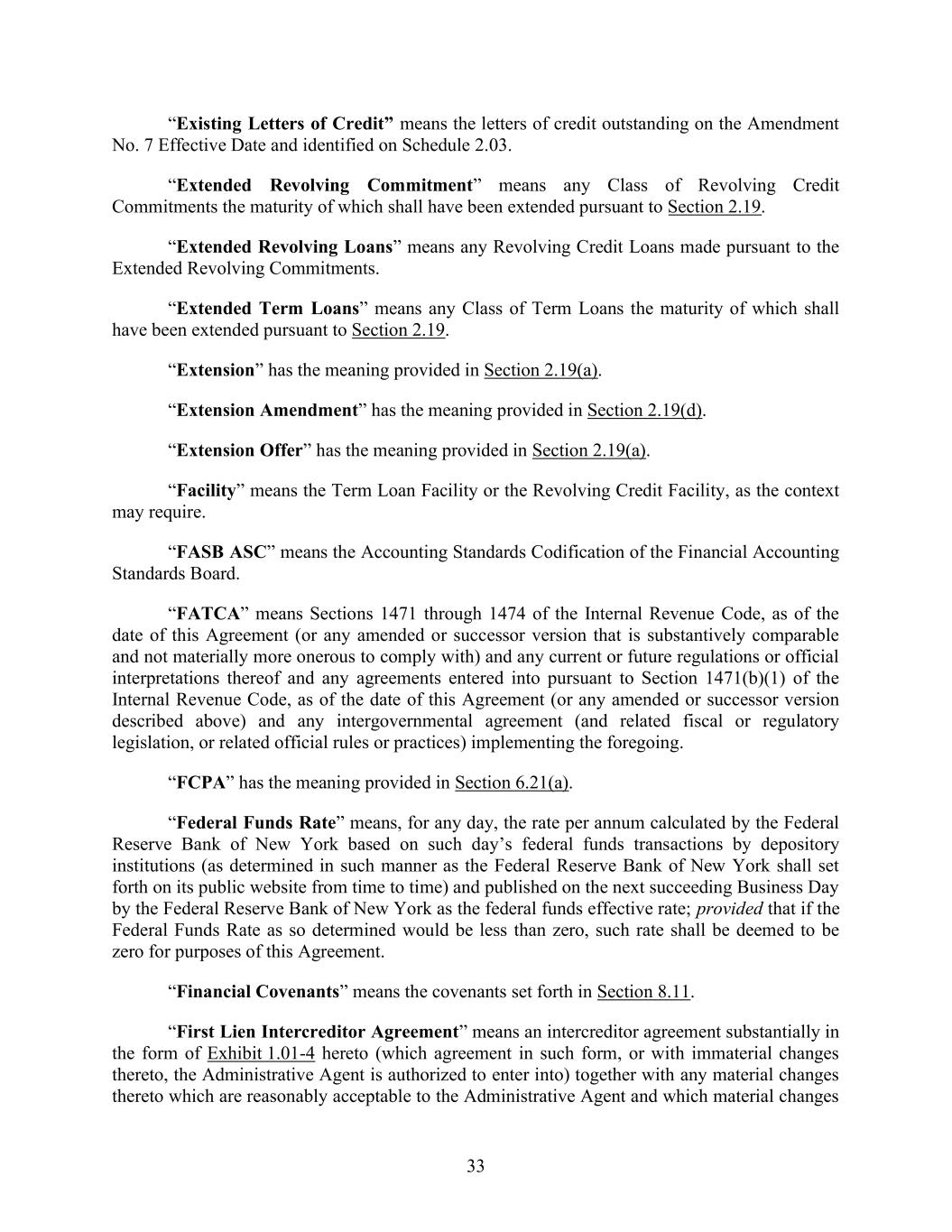 33 “Existing Letters of Credit” means the letters of credit outstanding on the Amendment No. 7 Effective Date and identified on Schedule 2.03. “Extended Revolving Commitment” means any Class of Revolving Credit Commitments the maturity of which shall have been extended pursuant to Section 2.19. “Extended Revolving Loans” means any Revolving Credit Loans made pursuant to the Extended Revolving Commitments. “Extended Term Loans” means any Class of Term Loans the maturity of which shall have been extended pursuant to Section 2.19. “Extension” has the meaning provided in Section 2.19(a). “Extension Amendment” has the meaning provided in Section 2.19(d). “Extension Offer” has the meaning provided in Section 2.19(a). “Facility” means the Term Loan Facility or the Revolving Credit Facility, as the context may require. “FASB ASC” means the Accounting Standards Codification of the Financial Accounting Standards Board. “FATCA” means Sections 1471 through 1474 of the Internal Revenue Code, as of the date of this Agreement (or any amended or successor version that is substantively comparable and not materially more onerous to comply with) and any current or future regulations or official interpretations thereof and any agreements entered into pursuant to Section 1471(b)(1) of the Internal Revenue Code, as of the date of this Agreement (or any amended or successor version described above) and any intergovernmental agreement (and related fiscal or regulatory legislation, or related official rules or practices) implementing the foregoing. “FCPA” has the meaning provided in Section 6.21(a). “Federal Funds Rate” means, for any day, the rate per annum calculated by the Federal Reserve Bank of New York based on such day’s federal funds transactions by depository institutions (as determined in such manner as the Federal Reserve Bank of New York shall set forth on its public website from time to time) and published on the next succeeding Business Day by the Federal Reserve Bank of New York as the federal funds effective rate; provided that if the Federal Funds Rate as so determined would be less than zero, such rate shall be deemed to be zero for purposes of this Agreement. “Financial Covenants” means the covenants set forth in Section 8.11. “First Lien Intercreditor Agreement” means an intercreditor agreement substantially in the form of Exhibit 1.01-4 hereto (which agreement in such form, or with immaterial changes thereto, the Administrative Agent is authorized to enter into) together with any material changes thereto which are reasonably acceptable to the Administrative Agent and which material changes