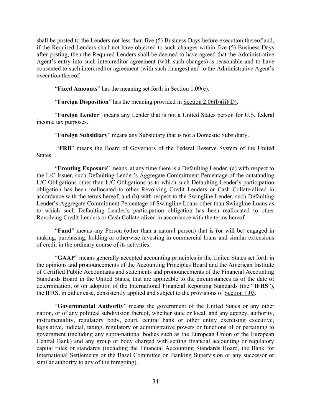 34 shall be posted to the Lenders not less than five (5) Business Days before execution thereof and, if the Required Lenders shall not have objected to such changes within five (5) Business Days after posting, then the Required Lenders shall be deemed to have agreed that the Administrative Agent’s entry into such intercreditor agreement (with such changes) is reasonable and to have consented to such intercreditor agreement (with such changes) and to the Administrative Agent’s execution thereof. “Fixed Amounts” has the meaning set forth in Section 1.09(e). “Foreign Disposition” has the meaning provided in Section 2.06(b)(ii)(D). “Foreign Lender” means any Lender that is not a United States person for U.S. federal income tax purposes. “Foreign Subsidiary” means any Subsidiary that is not a Domestic Subsidiary. “FRB” means the Board of Governors of the Federal Reserve System of the United States. “Fronting Exposure” means, at any time there is a Defaulting Lender, (a) with respect to the L/C Issuer, such Defaulting Lender’s Aggregate Commitment Percentage of the outstanding L/C Obligations other than L/C Obligations as to which such Defaulting Lender’s participation obligation has been reallocated to other Revolving Credit Lenders or Cash Collateralized in accordance with the terms hereof, and (b) with respect to the Swingline Lender, such Defaulting Lender’s Aggregate Commitment Percentage of Swingline Loans other than Swingline Loans as to which such Defaulting Lender’s participation obligation has been reallocated to other Revolving Credit Lenders or Cash Collateralized in accordance with the terms hereof. “Fund” means any Person (other than a natural person) that is (or will be) engaged in making, purchasing, holding or otherwise investing in commercial loans and similar extensions of credit in the ordinary course of its activities. “GAAP” means generally accepted accounting principles in the United States set forth in the opinions and pronouncements of the Accounting Principles Board and the American Institute of Certified Public Accountants and statements and pronouncements of the Financial Accounting Standards Board in the United States, that are applicable to the circumstances as of the date of determination, or on adoption of the International Financial Reporting Standards (the “IFRS”), the IFRS, in either case, consistently applied and subject to the provisions of Section 1.03. “Governmental Authority” means the government of the United States or any other nation, or of any political subdivision thereof, whether state or local, and any agency, authority, instrumentality, regulatory body, court, central bank or other entity exercising executive, legislative, judicial, taxing, regulatory or administrative powers or functions of or pertaining to government (including any supra-national bodies such as the European Union or the European Central Bank) and any group or body charged with setting financial accounting or regulatory capital rules or standards (including the Financial Accounting Standards Board, the Bank for International Settlements or the Basel Committee on Banking Supervision or any successor or similar authority to any of the foregoing).