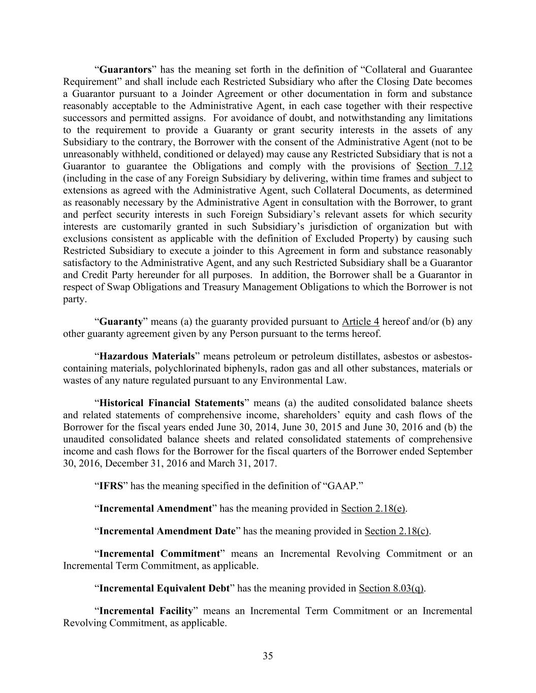 35 “Guarantors” has the meaning set forth in the definition of “Collateral and Guarantee Requirement” and shall include each Restricted Subsidiary who after the Closing Date becomes a Guarantor pursuant to a Joinder Agreement or other documentation in form and substance reasonably acceptable to the Administrative Agent, in each case together with their respective successors and permitted assigns. For avoidance of doubt, and notwithstanding any limitations to the requirement to provide a Guaranty or grant security interests in the assets of any Subsidiary to the contrary, the Borrower with the consent of the Administrative Agent (not to be unreasonably withheld, conditioned or delayed) may cause any Restricted Subsidiary that is not a Guarantor to guarantee the Obligations and comply with the provisions of Section 7.12 (including in the case of any Foreign Subsidiary by delivering, within time frames and subject to extensions as agreed with the Administrative Agent, such Collateral Documents, as determined as reasonably necessary by the Administrative Agent in consultation with the Borrower, to grant and perfect security interests in such Foreign Subsidiary’s relevant assets for which security interests are customarily granted in such Subsidiary’s jurisdiction of organization but with exclusions consistent as applicable with the definition of Excluded Property) by causing such Restricted Subsidiary to execute a joinder to this Agreement in form and substance reasonably satisfactory to the Administrative Agent, and any such Restricted Subsidiary shall be a Guarantor and Credit Party hereunder for all purposes. In addition, the Borrower shall be a Guarantor in respect of Swap Obligations and Treasury Management Obligations to which the Borrower is not party. “Guaranty” means (a) the guaranty provided pursuant to Article 4 hereof and/or (b) any other guaranty agreement given by any Person pursuant to the terms hereof. “Hazardous Materials” means petroleum or petroleum distillates, asbestos or asbestos- containing materials, polychlorinated biphenyls, radon gas and all other substances, materials or wastes of any nature regulated pursuant to any Environmental Law. “Historical Financial Statements” means (a) the audited consolidated balance sheets and related statements of comprehensive income, shareholders’ equity and cash flows of the Borrower for the fiscal years ended June 30, 2014, June 30, 2015 and June 30, 2016 and (b) the unaudited consolidated balance sheets and related consolidated statements of comprehensive income and cash flows for the Borrower for the fiscal quarters of the Borrower ended September 30, 2016, December 31, 2016 and March 31, 2017. “IFRS” has the meaning specified in the definition of “GAAP.” “Incremental Amendment” has the meaning provided in Section 2.18(e). “Incremental Amendment Date” has the meaning provided in Section 2.18(c). “Incremental Commitment” means an Incremental Revolving Commitment or an Incremental Term Commitment, as applicable. “Incremental Equivalent Debt” has the meaning provided in Section 8.03(q). “Incremental Facility” means an Incremental Term Commitment or an Incremental Revolving Commitment, as applicable.