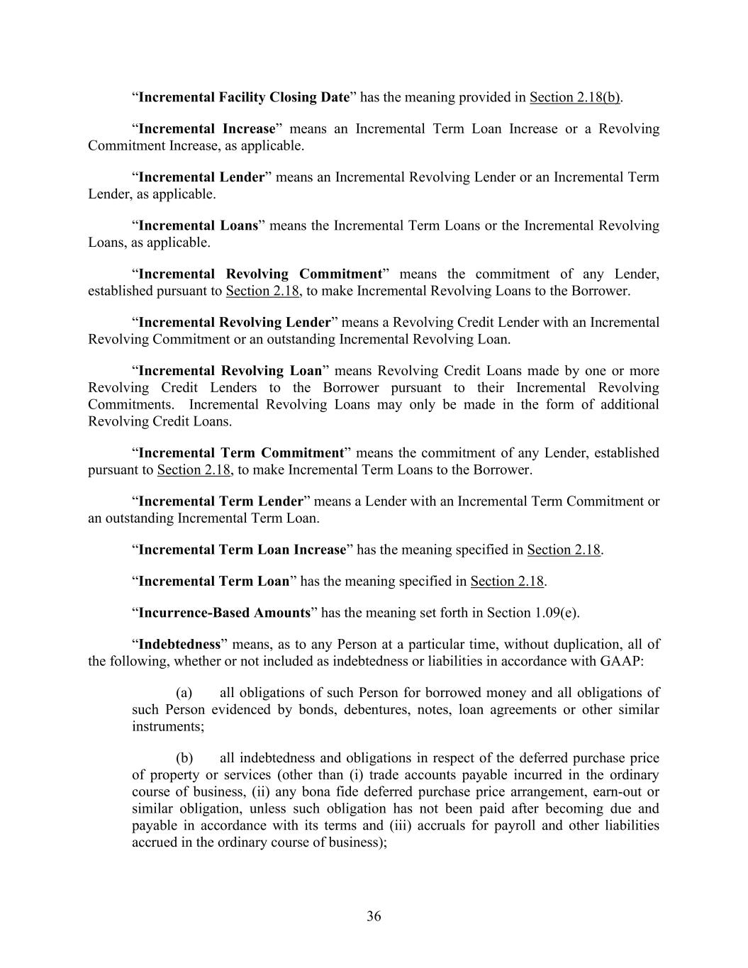 36 “Incremental Facility Closing Date” has the meaning provided in Section 2.18(b). “Incremental Increase” means an Incremental Term Loan Increase or a Revolving Commitment Increase, as applicable. “Incremental Lender” means an Incremental Revolving Lender or an Incremental Term Lender, as applicable. “Incremental Loans” means the Incremental Term Loans or the Incremental Revolving Loans, as applicable. “Incremental Revolving Commitment” means the commitment of any Lender, established pursuant to Section 2.18, to make Incremental Revolving Loans to the Borrower. “Incremental Revolving Lender” means a Revolving Credit Lender with an Incremental Revolving Commitment or an outstanding Incremental Revolving Loan. “Incremental Revolving Loan” means Revolving Credit Loans made by one or more Revolving Credit Lenders to the Borrower pursuant to their Incremental Revolving Commitments. Incremental Revolving Loans may only be made in the form of additional Revolving Credit Loans. “Incremental Term Commitment” means the commitment of any Lender, established pursuant to Section 2.18, to make Incremental Term Loans to the Borrower. “Incremental Term Lender” means a Lender with an Incremental Term Commitment or an outstanding Incremental Term Loan. “Incremental Term Loan Increase” has the meaning specified in Section 2.18. “Incremental Term Loan” has the meaning specified in Section 2.18. “Incurrence-Based Amounts” has the meaning set forth in Section 1.09(e). “Indebtedness” means, as to any Person at a particular time, without duplication, all of the following, whether or not included as indebtedness or liabilities in accordance with GAAP: (a) all obligations of such Person for borrowed money and all obligations of such Person evidenced by bonds, debentures, notes, loan agreements or other similar instruments; (b) all indebtedness and obligations in respect of the deferred purchase price of property or services (other than (i) trade accounts payable incurred in the ordinary course of business, (ii) any bona fide deferred purchase price arrangement, earn-out or similar obligation, unless such obligation has not been paid after becoming due and payable in accordance with its terms and (iii) accruals for payroll and other liabilities accrued in the ordinary course of business);